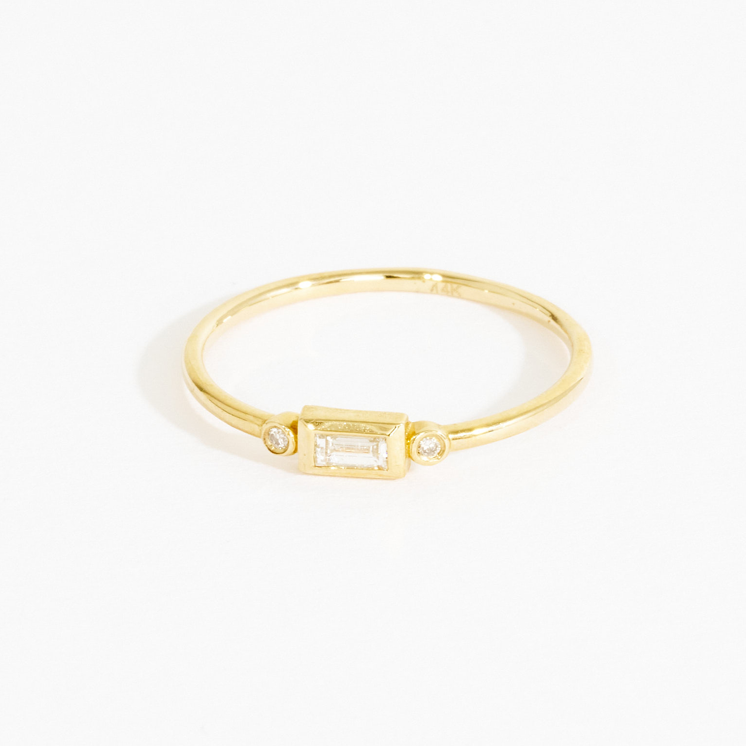 An intricate and graceful ring made for timeless wear. Handcrafted in 14k solid gold, the baguette cut diamond bezel rests between the two round diamond bezels, sparkling like the sun’s rays shining down onto your finger. A dainty and sparkling everyday ring that will look great stacked with other delicate rings or even by itself.