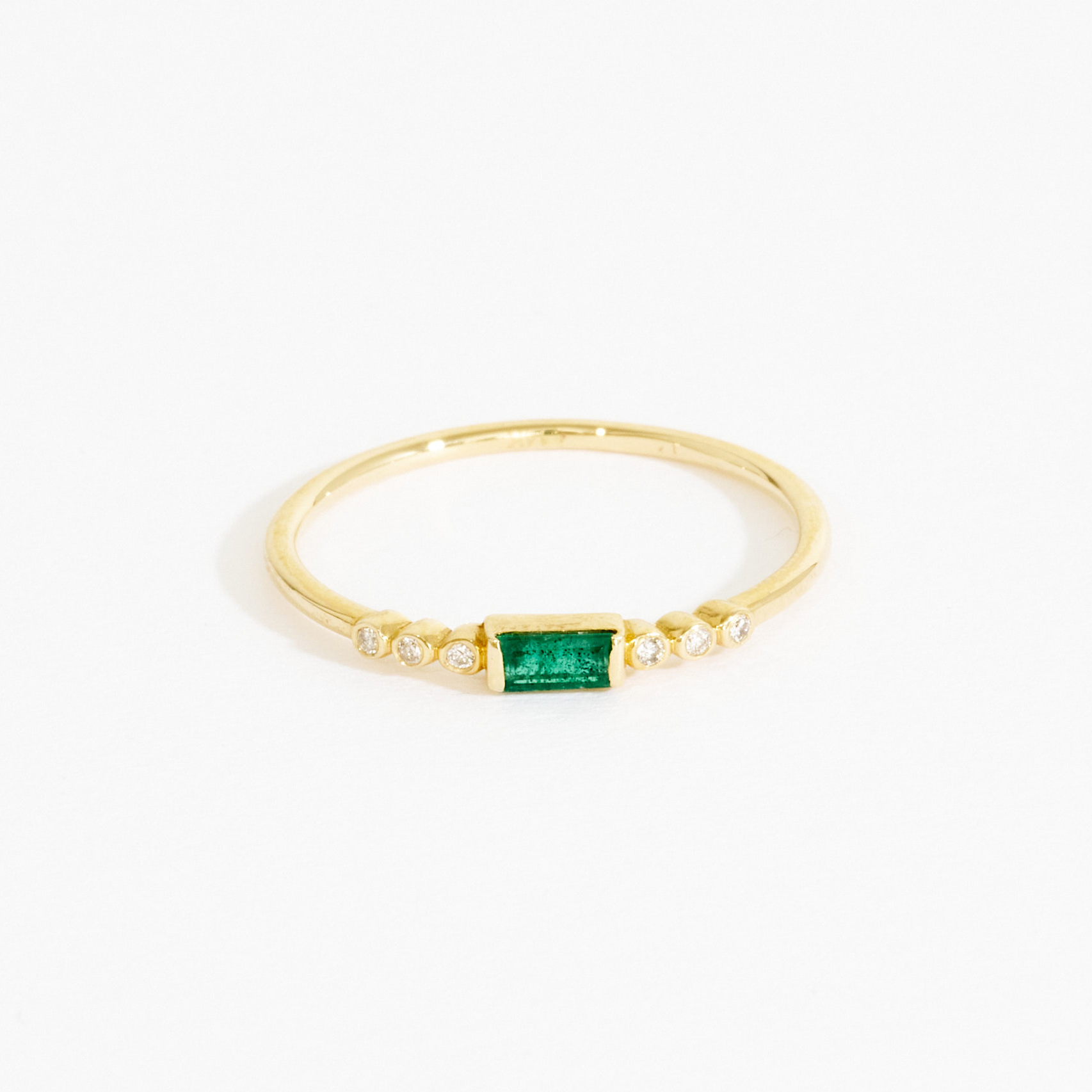 The perfect ring for the fashionable woman seeking a simple piece to slip onto their fingers. Handcrafted in 14k solid gold, the rectangular emerald diamond held by prongs is flanked by three small diamond bezels on each side. A dainty ring that is fit for everyday wear, this timeless piece can be stacked with other rings to fit your style.