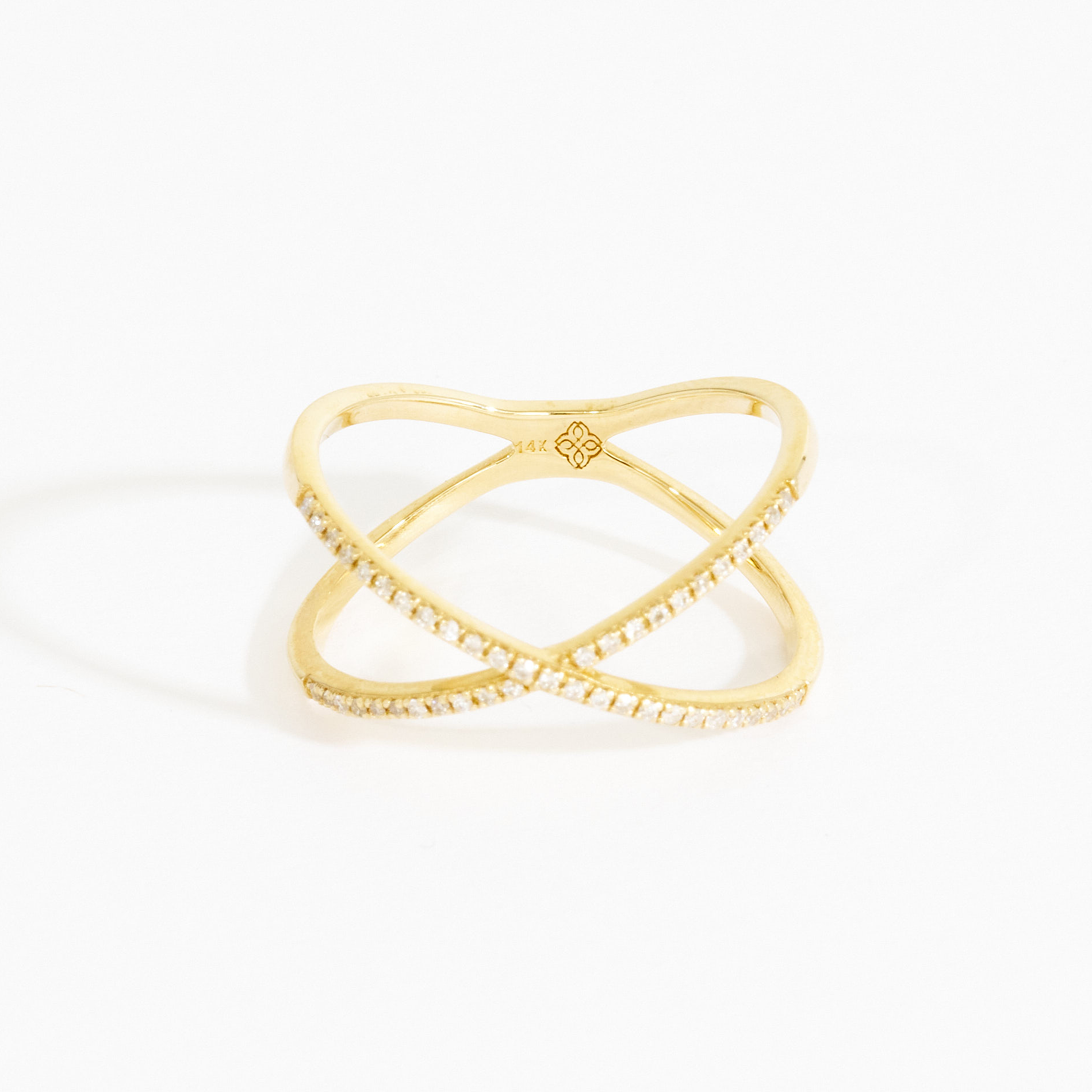 Style your fingers with a timeless statement piece. A delicately crafted 14k solid gold band, the criss-crossing bands are partially micro-paved with glamorous diamonds to give it a chic accent. An everyday ring that you don’t need to take off, this is a must have piece for the modern and trendy woman.
