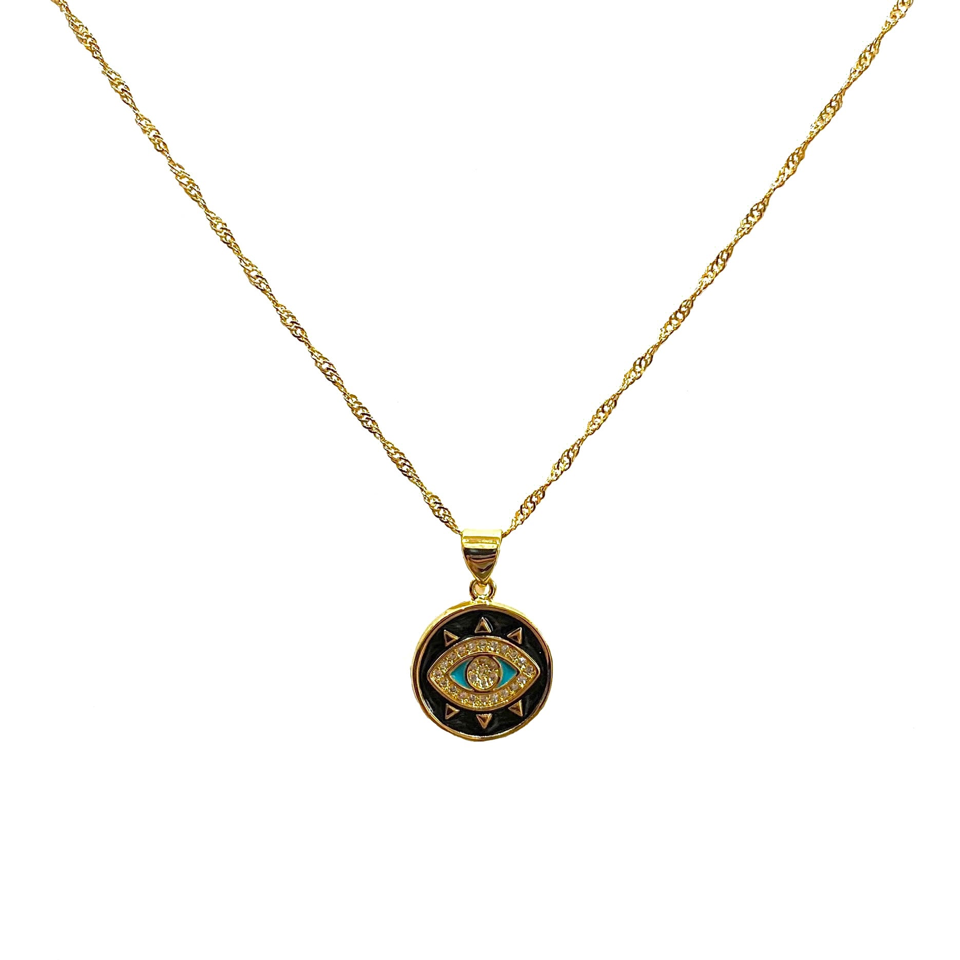For the trendy and spiritual woman, add our Enamel Evil Eye Necklace to your layer for everyday protect from negative energies. The black enamel pendant features a cubic zirconia paved evil eye design that is filled with a turquoise enamel. The pendant hangs from a dainty singapore twist chain that will look fancy when added to your necklace layer! Makes the perfect gift for loved ones for any occasion.