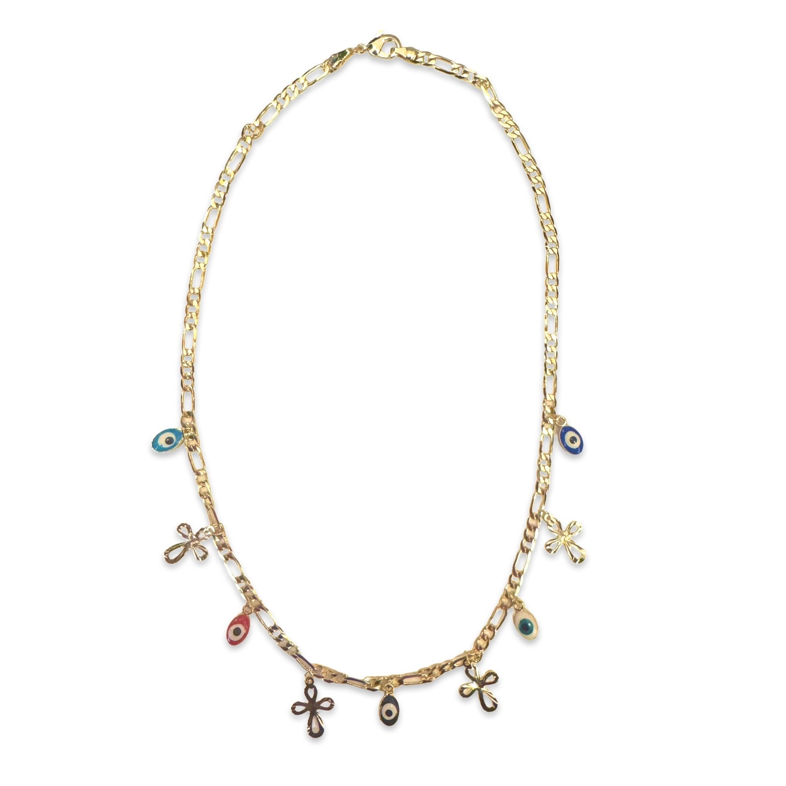 For the trendy and spiritual woman, add our Evil Eye Cross Charm Necklace to your layer for everyday protect from negative energies. The bold figaro chain is stationed with evil eye and rounded cross charms dangling all around. Makes the perfect gift for loved ones for any occasion.