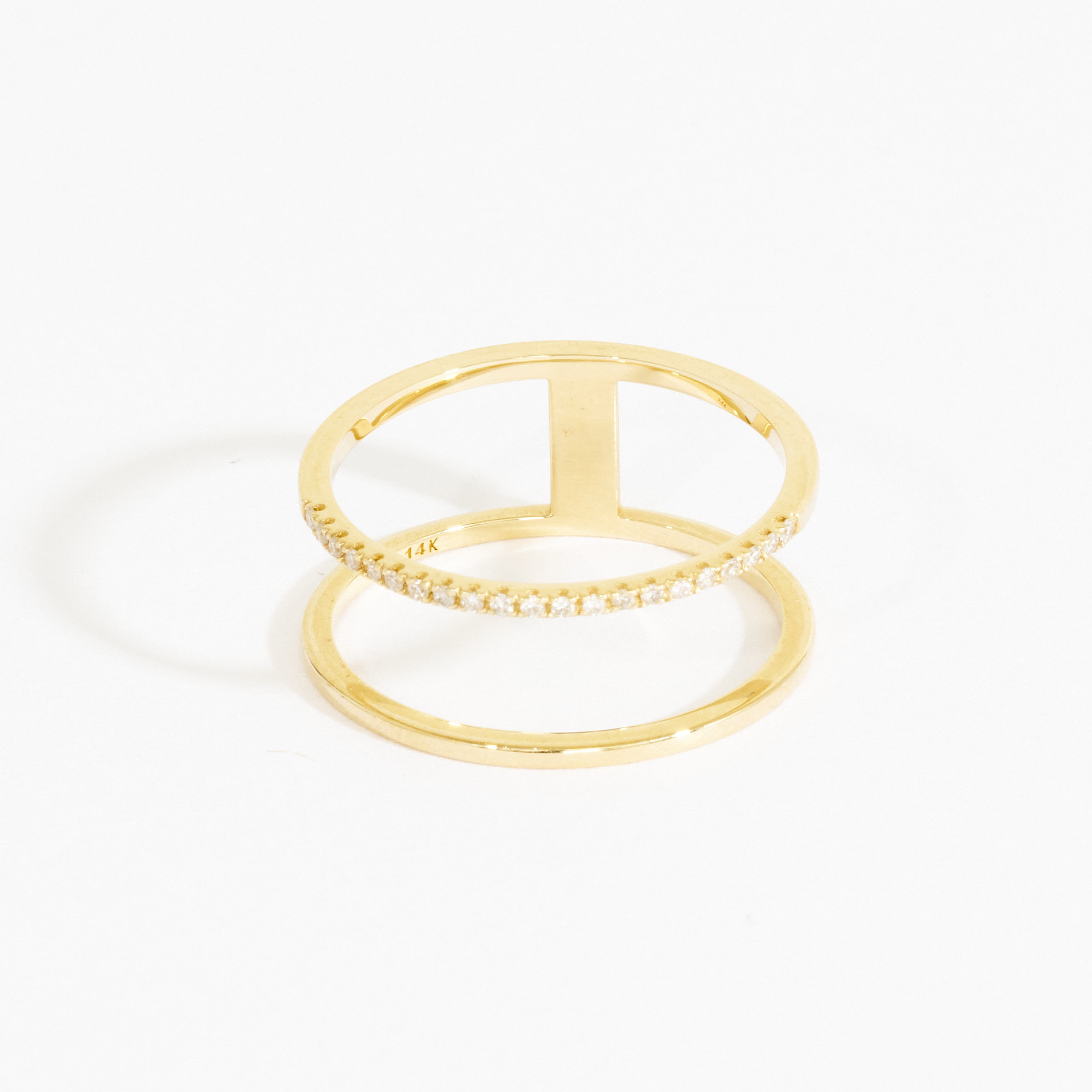 Style your fingers with a timeless piece that is subtle but trendy. A delicately crafted 14k solid gold band with one micro-paved band and one that is polished to shine, the thick bar that connects them at the back gives off the illusion that tht top band is floating. Diamonds at the top or bottom, this everyday ring can stay on all day long and is a must have piece for the modern and trendy woman.