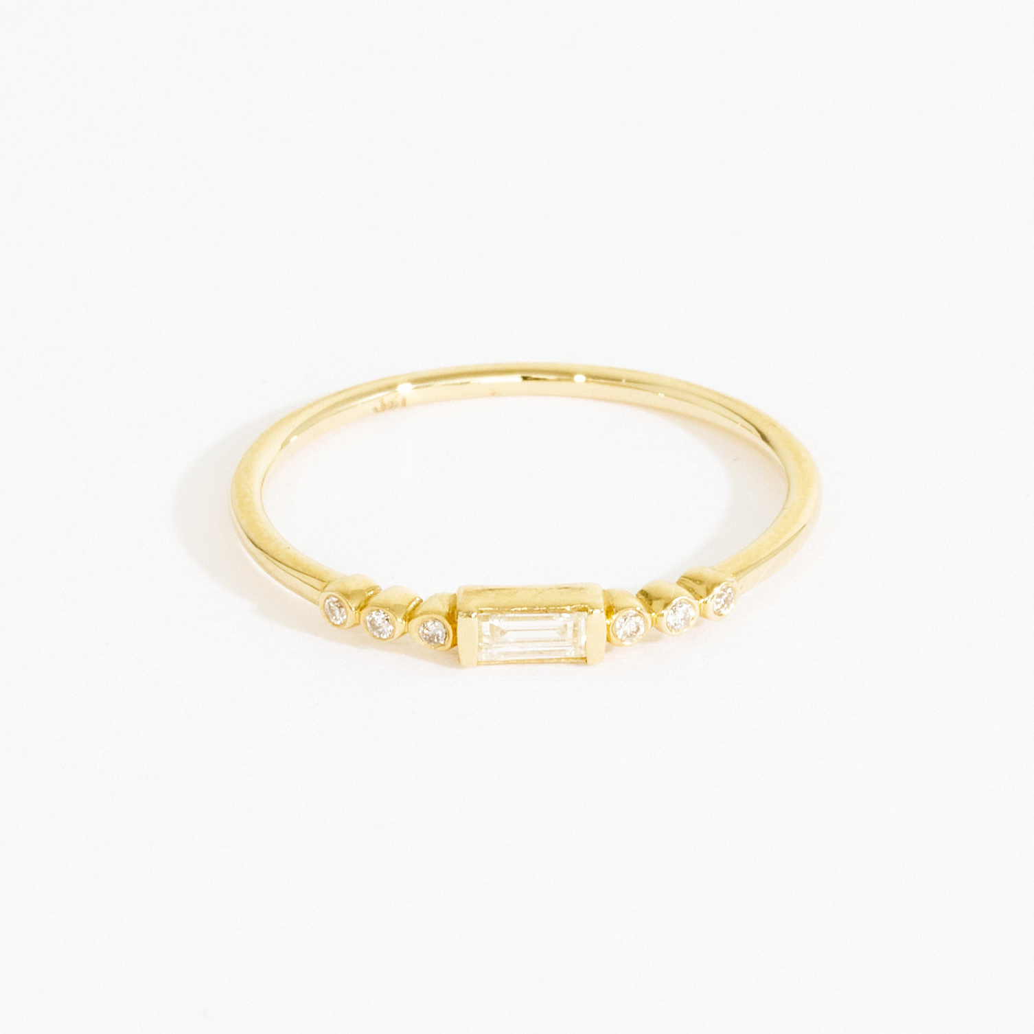 A dainty and graceful ring made for timeless wear. Handcrafted in 14k solid gold, the baguette cut diamond sits in the center of the polished band with three diamond bezels lined up on each side. A simple flare of sparkle when worn alone, but a worthy piece that will bring out the beauty of your everyday ring stack.