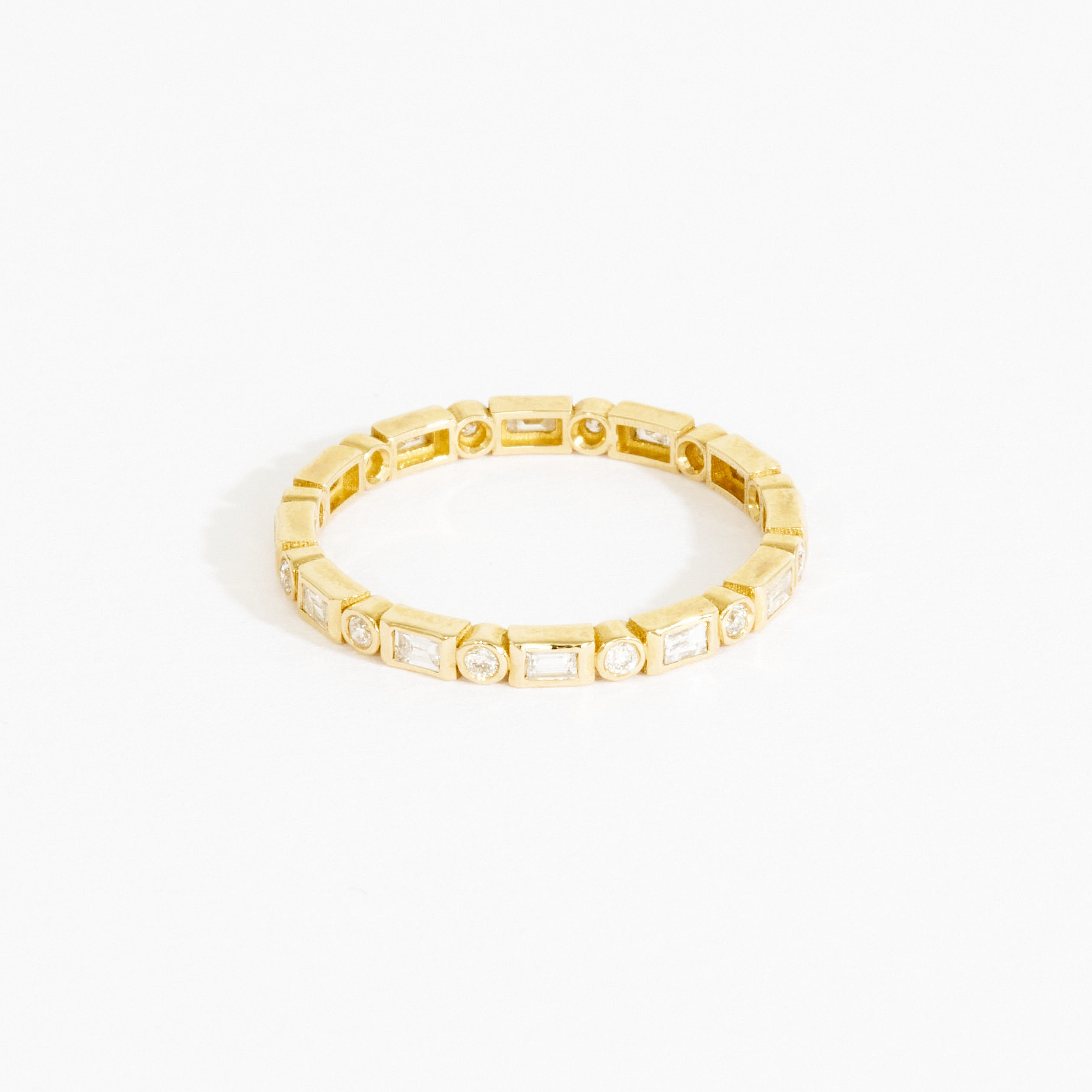 All around breathtaking with just a simplistic design. A delicately crafted 14k solid gold band, the bezel baguette and round diamonds give it a stunning look for the ages. A stackable ring that you will never want to leave your side as it sparkles endlessly without fade.