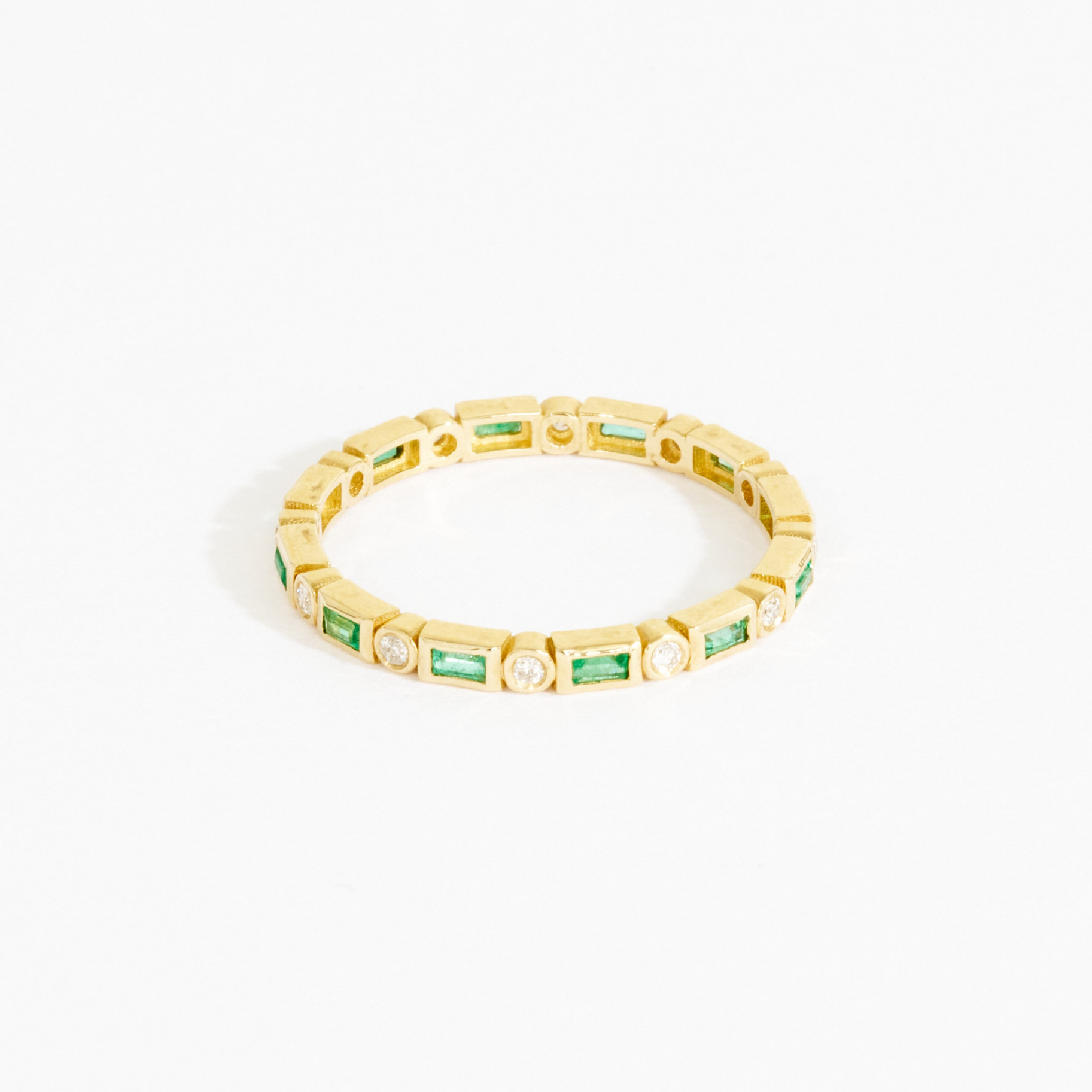 Breathtaking and elegant design that can be worn alone or stacked. A delicately crafted 14k solid gold band, the emerald baguette and clear round diamonds give it a stunning look for the ages. An everyday ring that will not come off once it slips onto your finger, it makes for a delicate accent piece for the trendy ring stack.