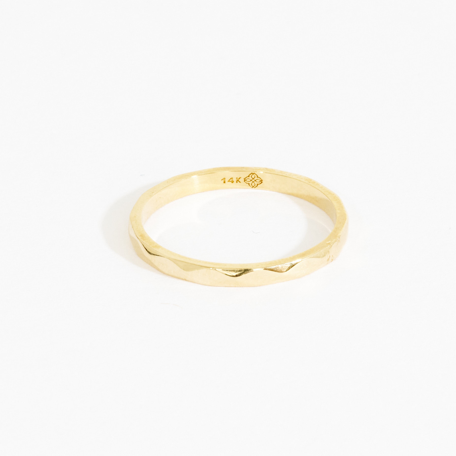 An intricate piece that will shine for a long time without tarnishing. Handcrafted in 14k solid gold, the faceted surface that is polished to shine will be the highlight to your ring stack. A contemporary and stylish piece that will also look chic by itself.
