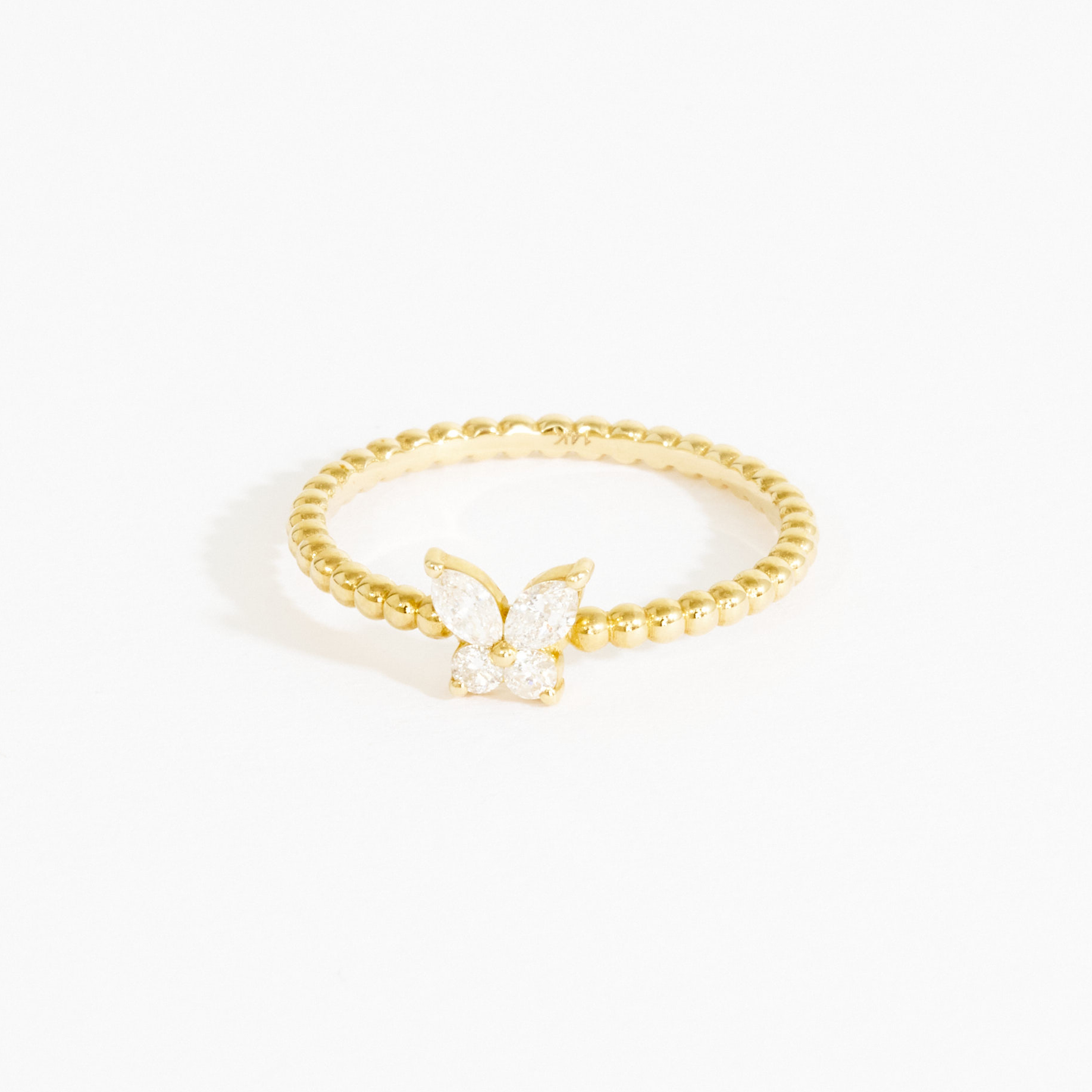 Heart-fluttering in every way and made for timeless wear. Handcrafted in 14k solid gold, the beaded band holds a sparkling butterfly design that is made up of two marquise and round diamonds held together by a set of prongs. A dainty and sparkling everyday ring that will look great stacked with other delicate rings or even by itself.
