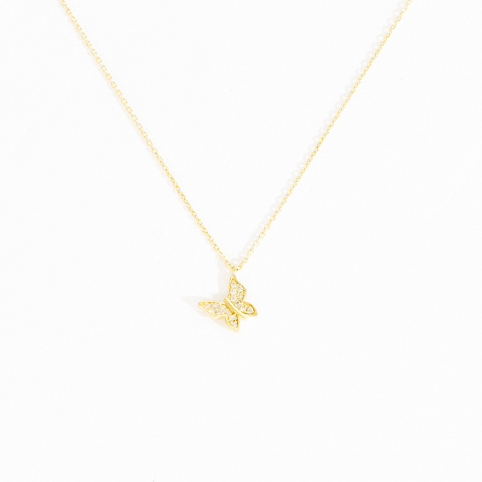 Heart-fluttering in every way and made for timeless wear. Handcrafted in 14k solid gold, the dangling butterfly charm is paved in dazzling little diamonds and hangs by the wing tip on the dainty gold chain. A delicate, yet glamorous everyday necklace for her that will look great when worn alone or layered with other delicate pieces.