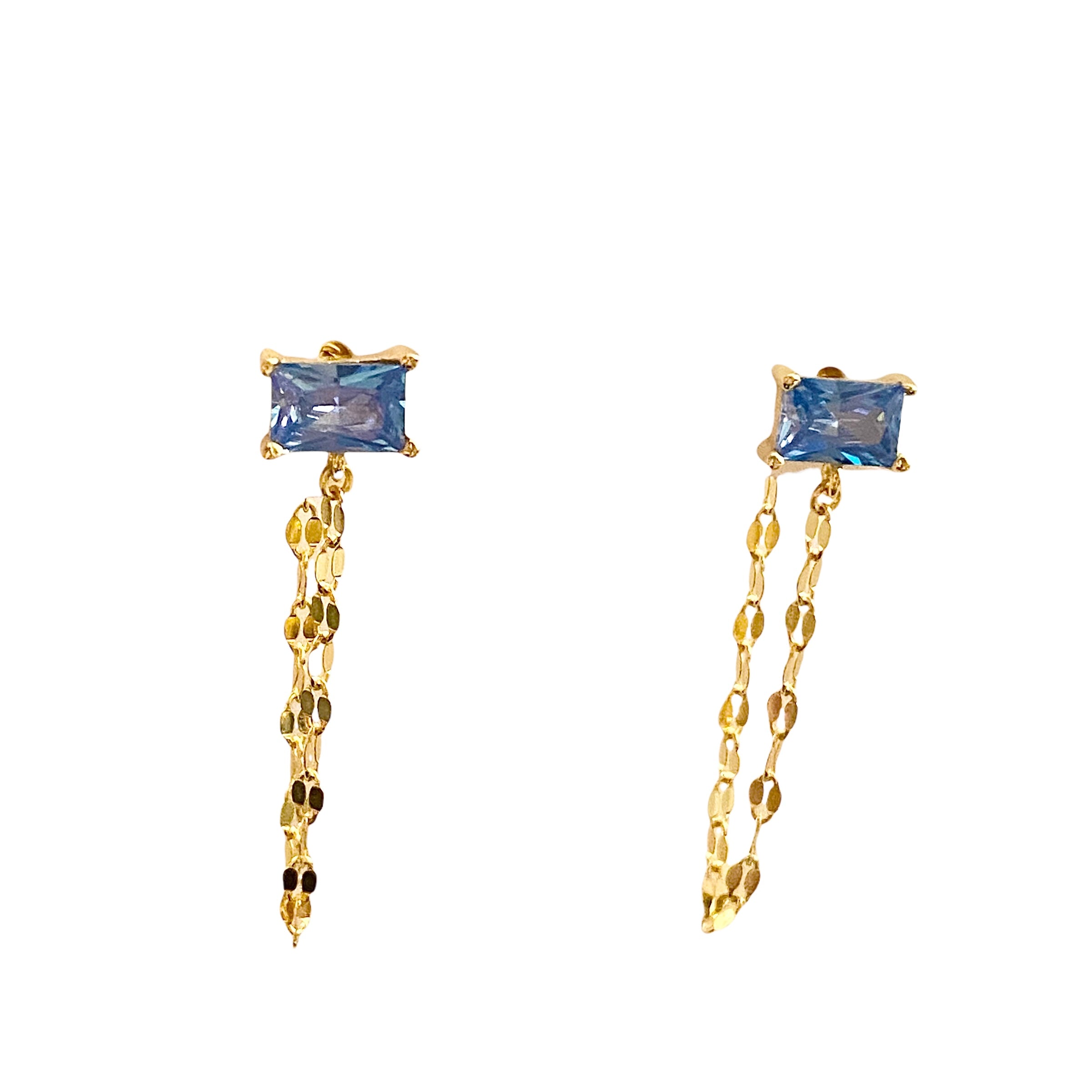 Our Amy Chain Stud Earrings feature a sparkly rectangle birthstone stud that is followed by a dainty chain that falls in front and back of your ear. Simple and modern enough to wear everyday. For those with multiple holes, these look fierce when stacked with other geometric Noellery earrings.