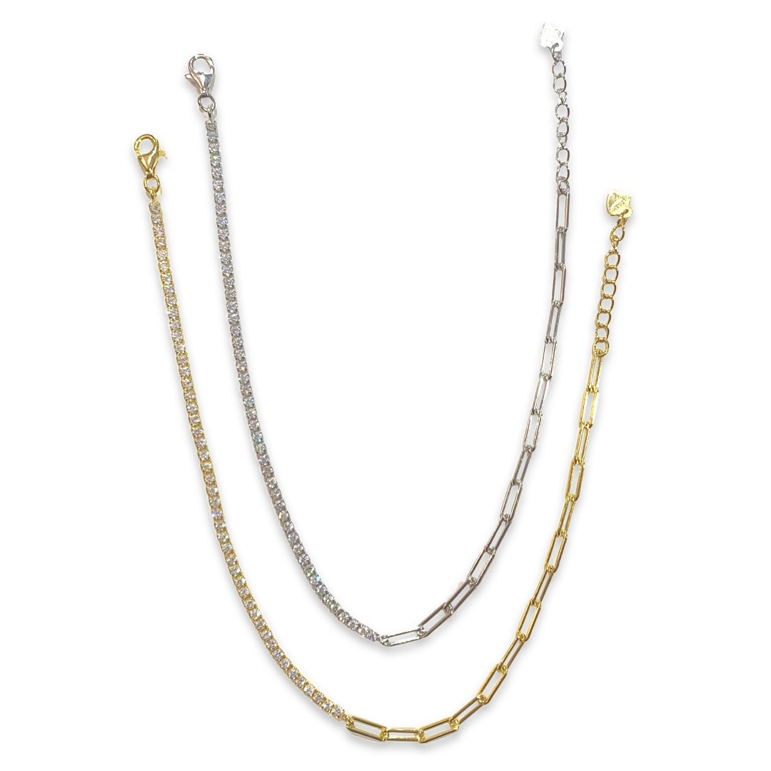 Style your ankle with a dazzling and chic look with our well crafted Amy Half Chain Link Anklet! This eye-catching anklet features a row of shimmering cubic zirconia stones on one side and a shiny sterling silver chain on the other, making your ankle sparkle with each confident step you take! Can be worn alone or with other Noellery anklets to create that dainty and sparkling ankle stack!
