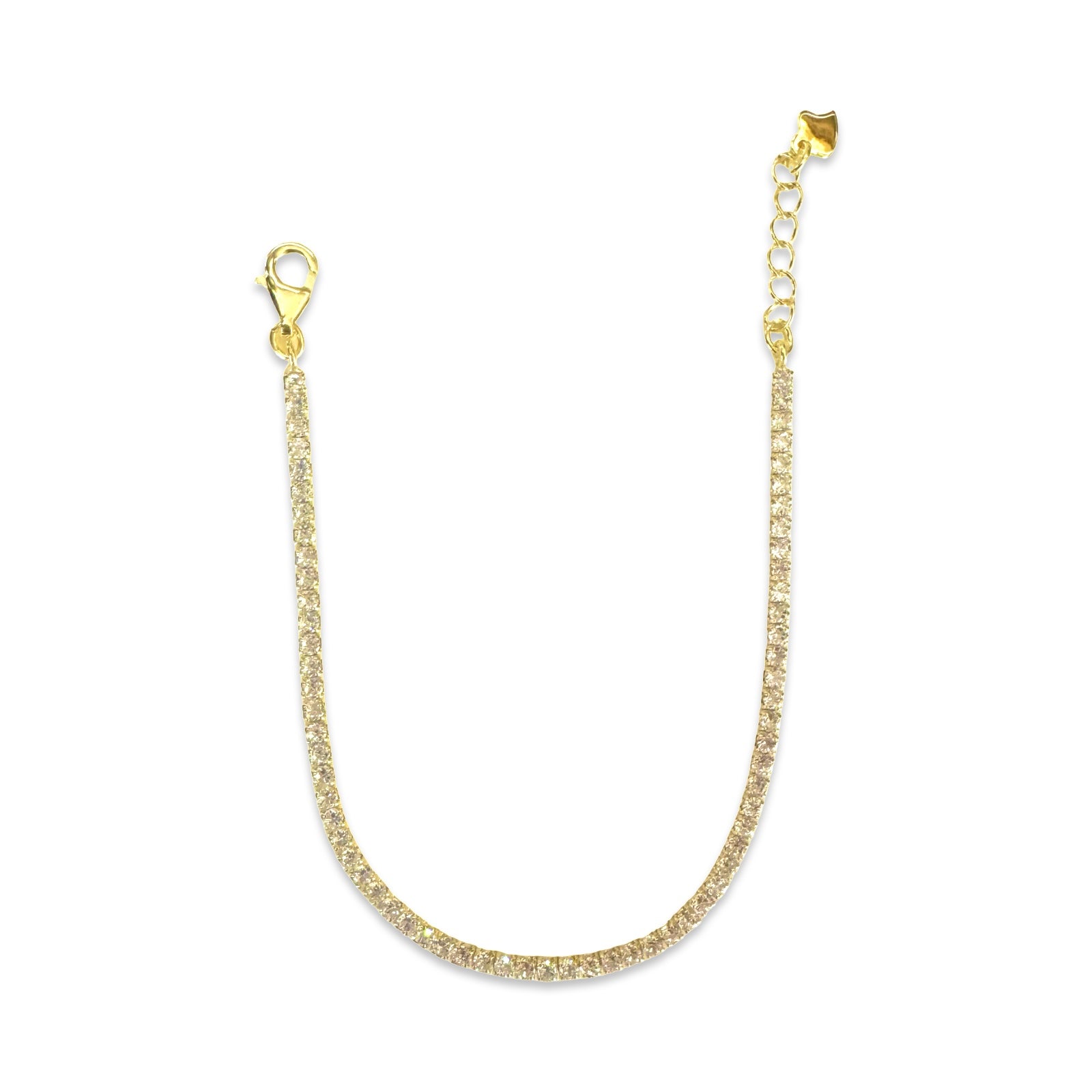 Our Amy Tennis Bracelet features a channel of sparkling clear cubic zirconia stones that give off a diamond like shine. Adjustable with a max length of 7". Makes a great addition to any wrist stack or may be worn solo on its own.