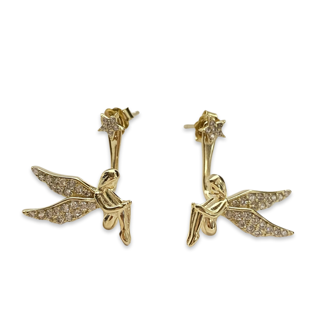 Our handmade angel wing jacket earrings are a must have addition to your jewelry box. Features a sitting angel whose wings are micro-paved in sparkly clear cubic zirconia stones. Dainty star stud goes into your ear, and the angel falls underneath the lobe to give your ear a magical floating look. A reminder that you always have angel by your side. Makes a thoughtful gift to your loved ones on any occasion.