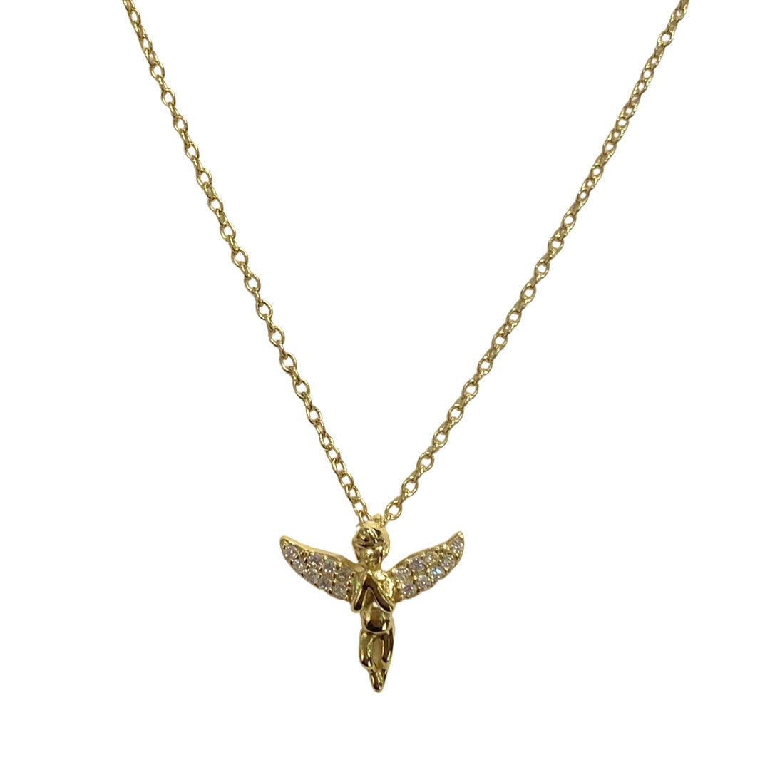 In loving memory of the fallen, our Flying Angel necklace serves as a celestial bodyguard. Features a delicate guardian angel whose wings are micro paved with sparkly clear cubic zirconia stones. May it guide and protect the wearer through life. Necklace may be layered with other dainty chains or worn solo on its own.