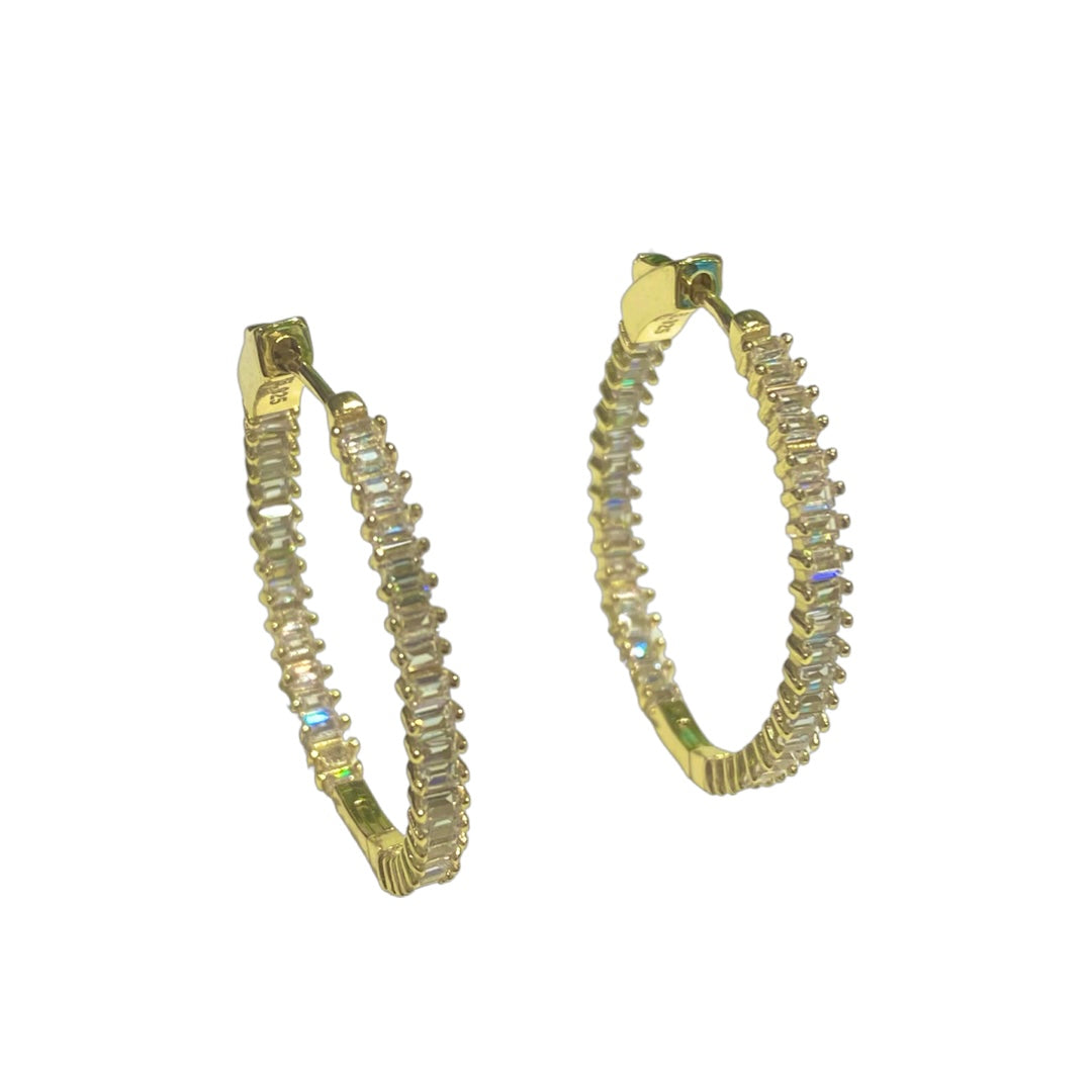 Add some bling to your ears and adorn our Thin Baguette Hoops! These hoops feature a channel of baguette cut cubic zirconia stones on the front and inside, so they can sparkle no matter which way you turn! With a french clasp backing, it ensures the wearer a secure fit with no fear of falling off. Lovely when worn with your hair own up, these hoops can be worn dressed up or down by itself, or even stacked with other Noellery earrings for those with multiple piercings! Makes a great gift to your loved one as well for any occasion!