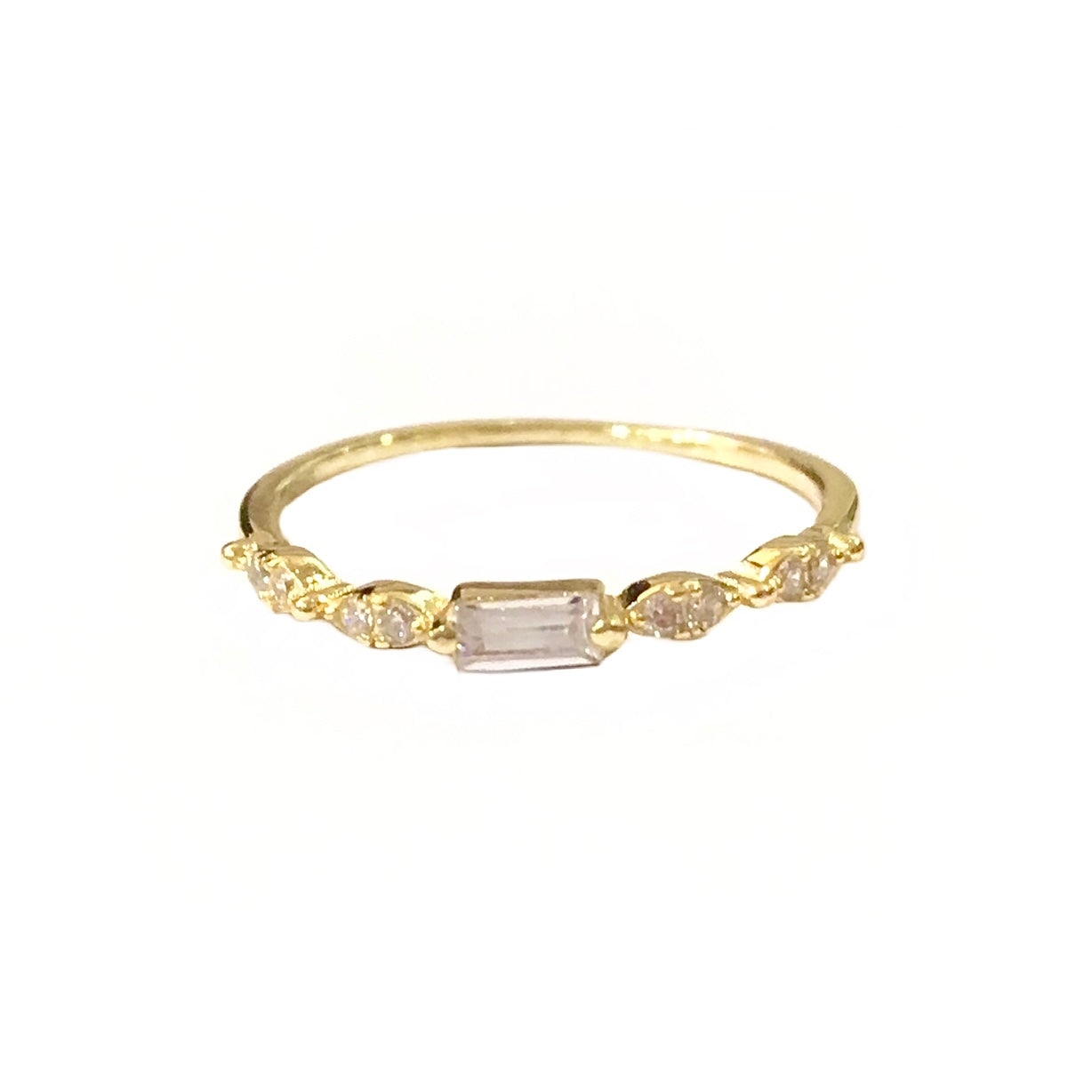 Stack with Noellery and slip on our dainty Baguette Marquise Partial Ring! Features a shiny sterling silver band with a single baguette cut cubic zirconia stone in the center and is flanked by cubic zirconia bezeled marquise shapes on both sides. Makes a great addition to any ring stack but lovely when worn by itself.