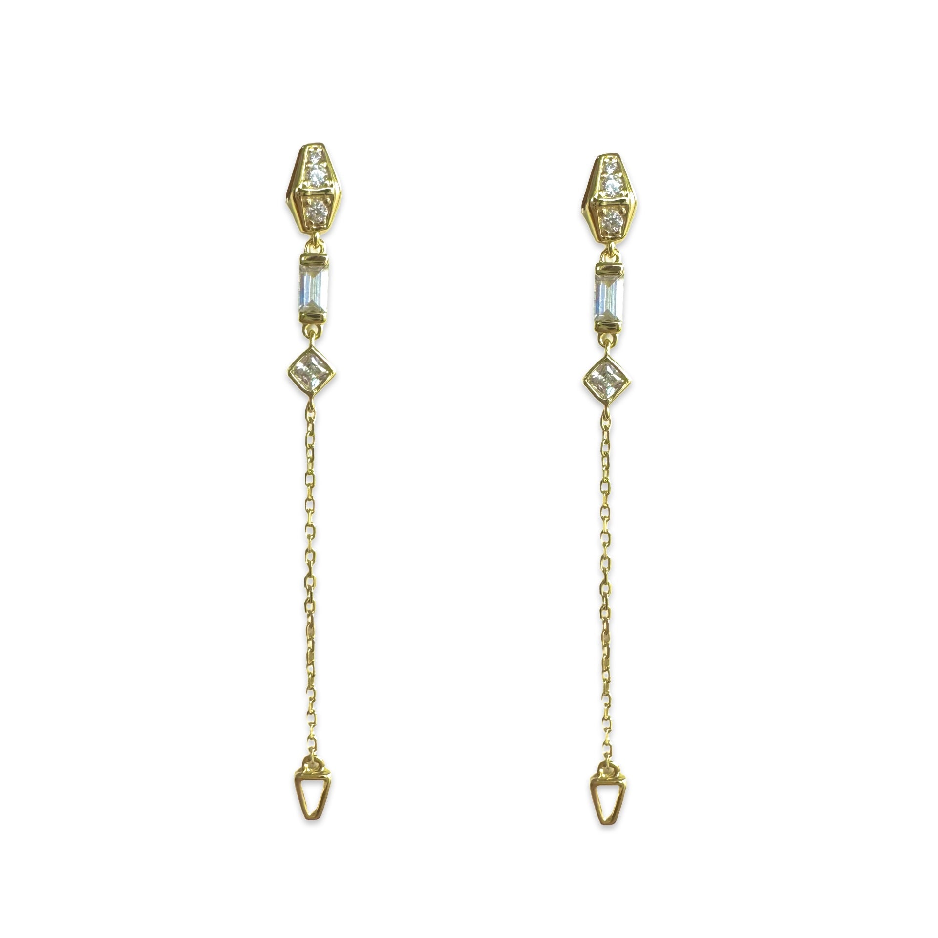 A dainty piece that will add a touch of sparkle to any outfit, throw on our darling Borisa Drop Studs today! Features baguette cubic zirconia stones that drop down to a dainty chain and ends with a pentagon charm. The perfect everyday earring that looks cute when worn alone but can be stacked with other sparkly Noellery earrings!