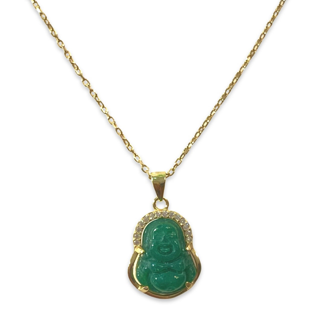 Enhance your aura by wearing our Buddha Necklace. Features a laughing buddha gemstone pendant that is surrounded by a partial halo of sparkly cubic zirconia stones around the head of the buddha. May be layered with other spiritual Noellery necklaces or worn solo. The laughing buddha is the symbol of happiness, good fortune, and life fulfillment. Makes a thoughtful gift for your spiritual loved one.