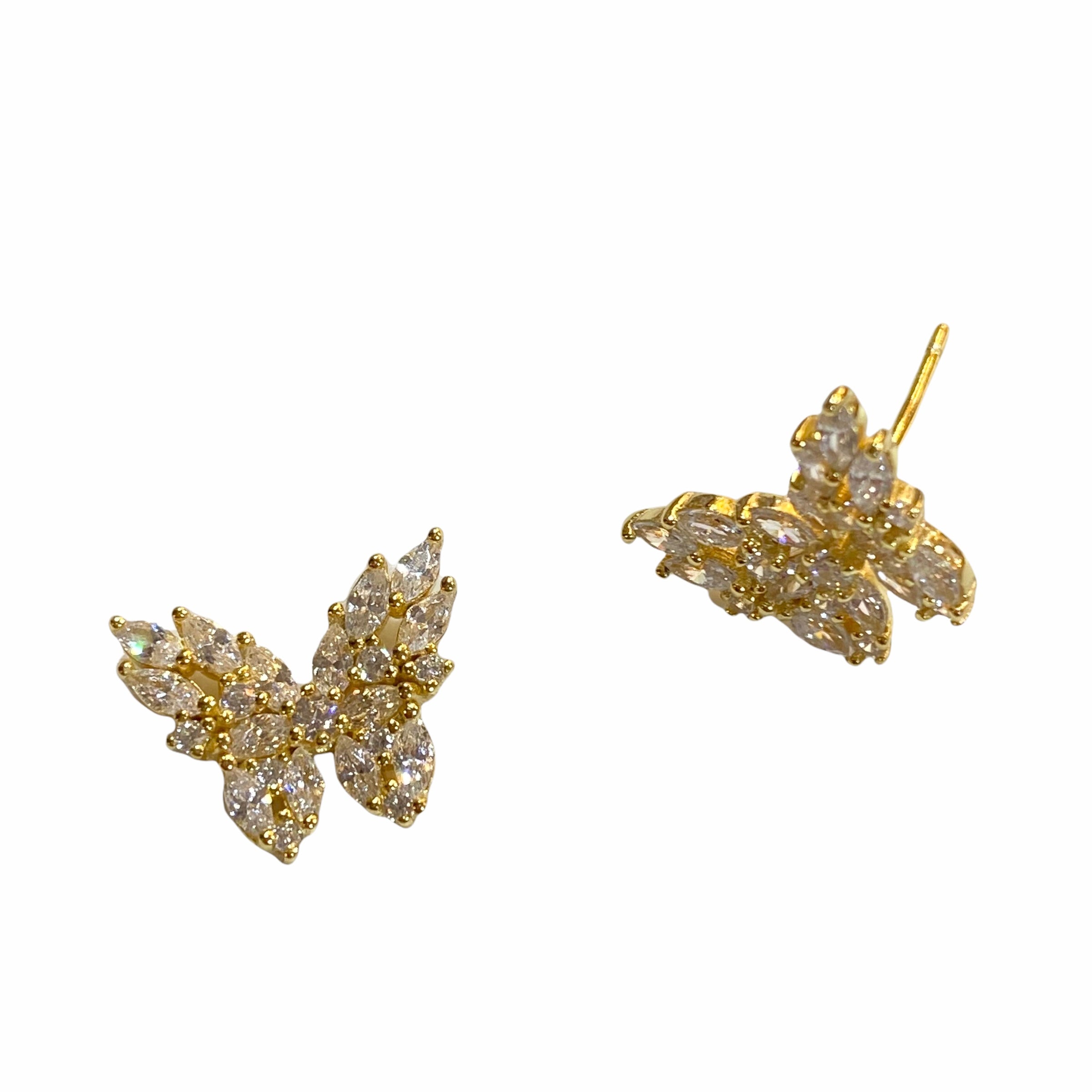 Fly away with our Sweet Butterfly studs. Features a butterfly silhouette that is bedazzled with a cluster of marquis and round cubic zirconia stones all around. Twinkles with every turn and makes a great addition to any ear stack. Butterflies represent hope, endurance, and growth. Makes a thoughtful gift for your loved one on any occasion.