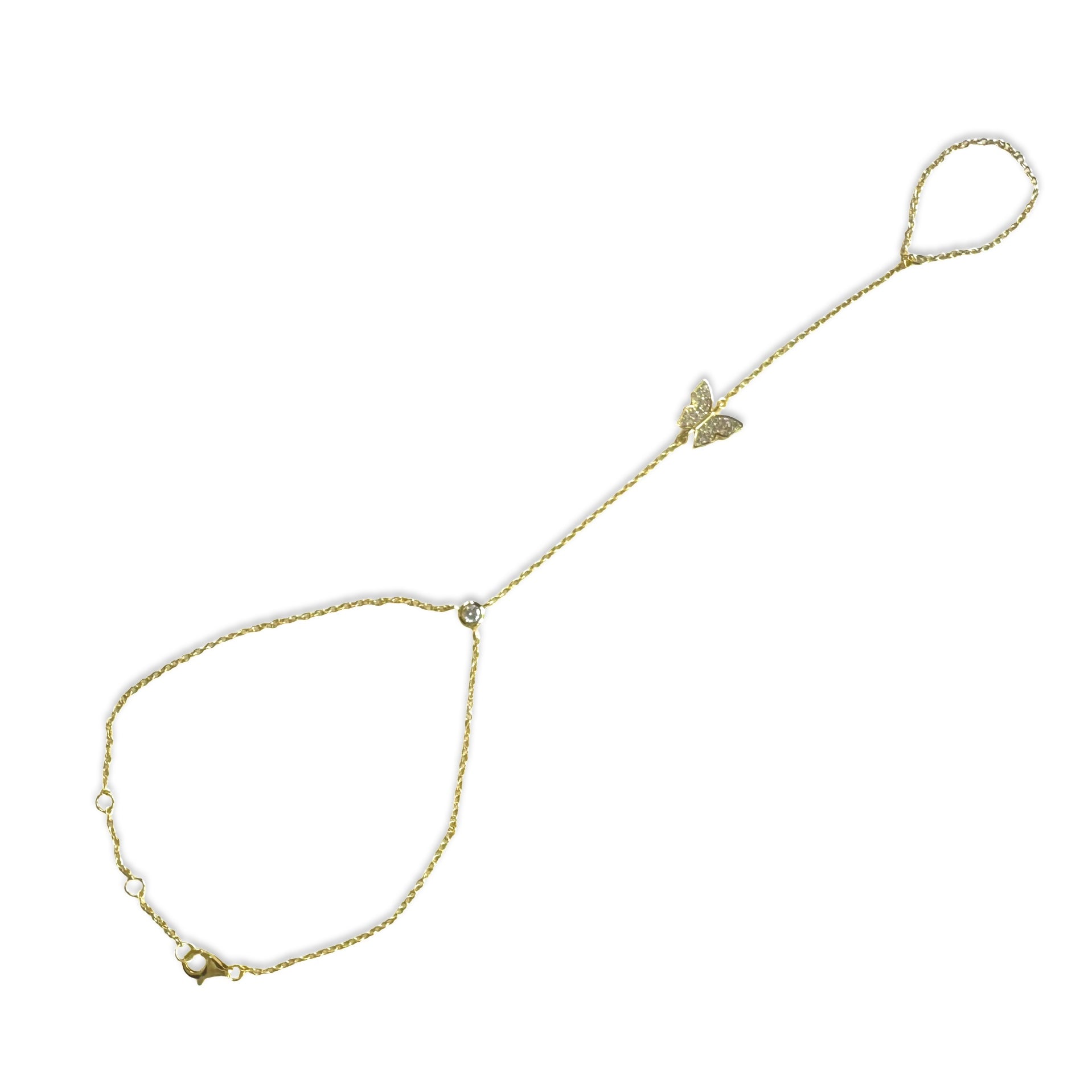 A hand chain for everyday wear. Our Single Butterfly Hand Chain is handcrafted with a plated sterling silver chain that loops from your finger to your wrist. The cubic zirconia butterfly in the center will sparkle with every turn of your hand. Stack it with other Noellery bracelets and rings to compliment your outfits.
