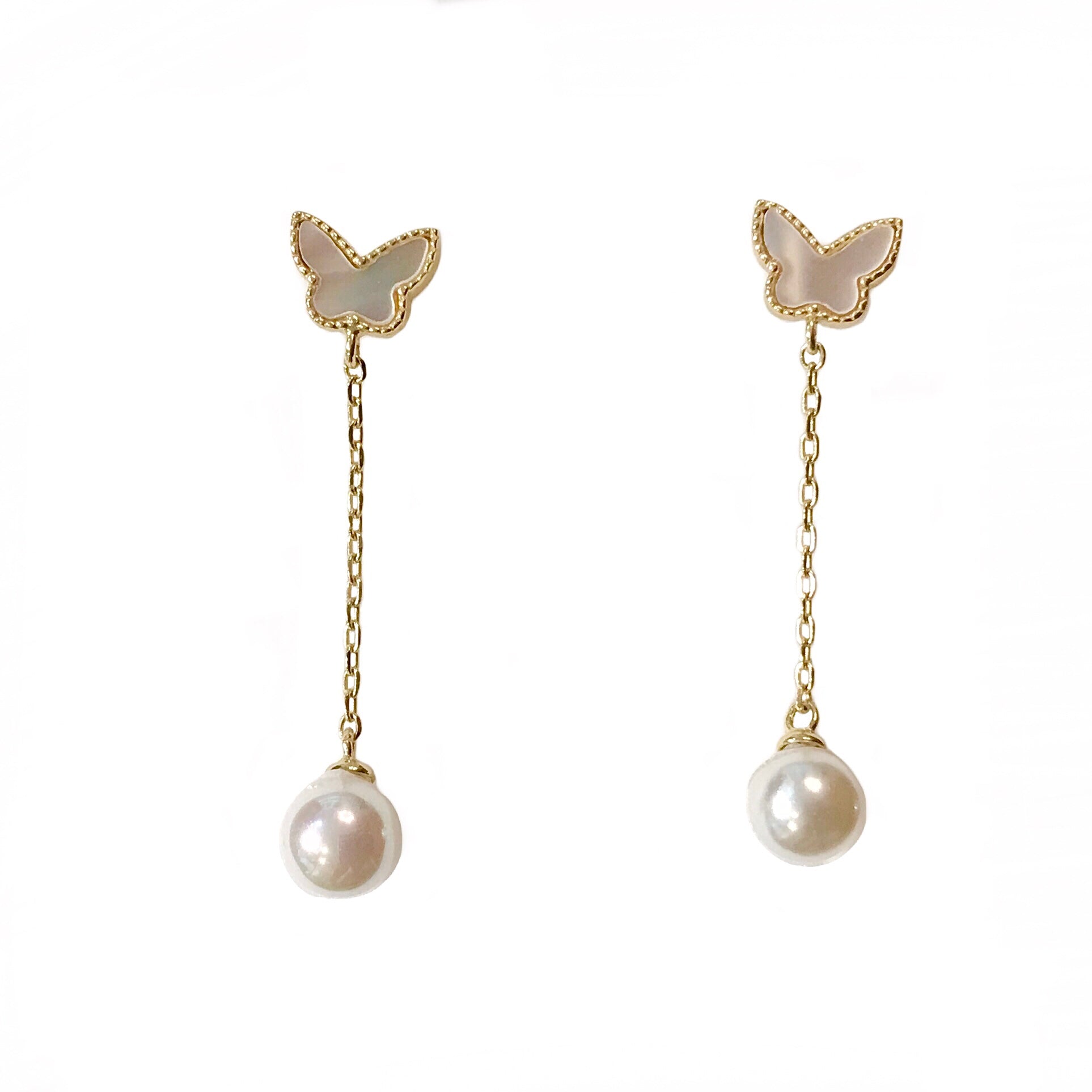Elegantly stunning, our Butterfly MOP Dangle Earrings can be worn to special occasions or as an everyday pair of earrings! This pair of earrings feature a small mother of pearl butterfly stud with a moonstone bead dangling underneath it from a thin sterling silver chain. For all the butterfly lovers out there, try mix and matching it with other heart fluttering accessories from our Noellery butterfly collection!