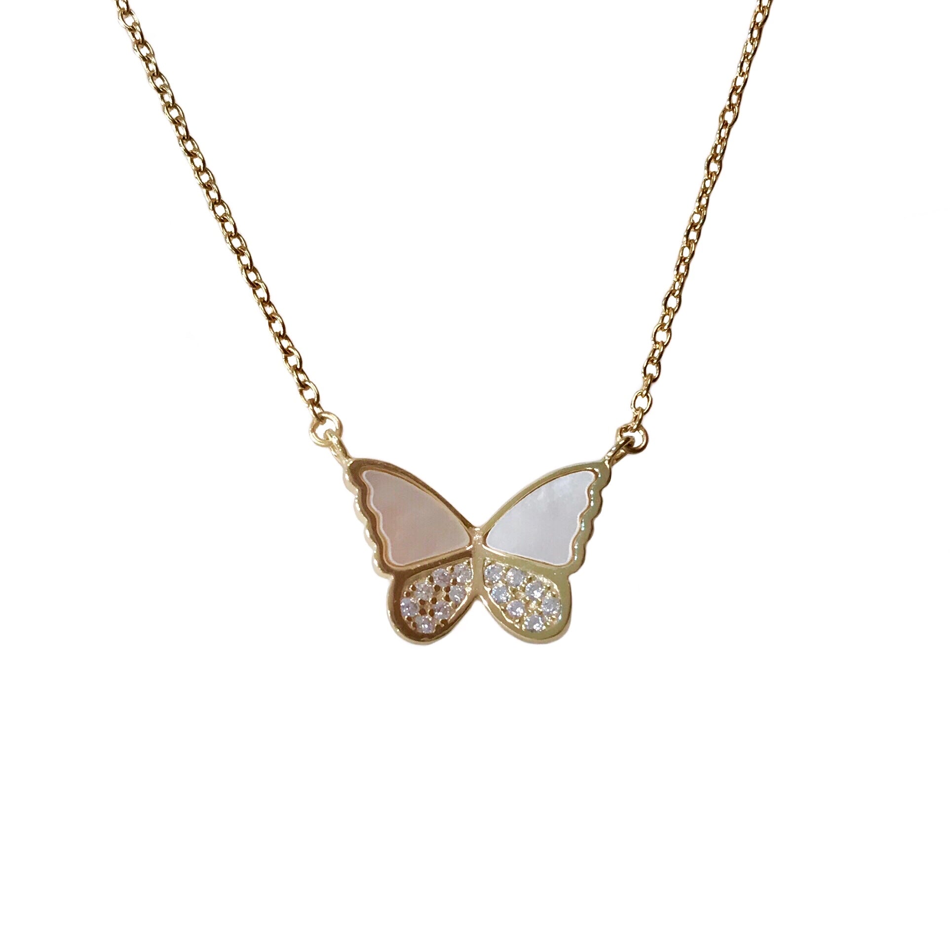 Flutter away with elegance and beauty while adorning our Butterfly Pearl Necklace! This lovely necklace features a butterfly charm hanging from a shiny sterling silver chain. The top half of the butterfly charm is elegantly decorated with Mother of Pearl, while the bottom half is paved in sparkling cubic zirconia stones. Makes a heart-felt gift to your loved one and can be worn with other Noellery necklaces or chokers to create a sparkling necklace layer that you can wear everyday!