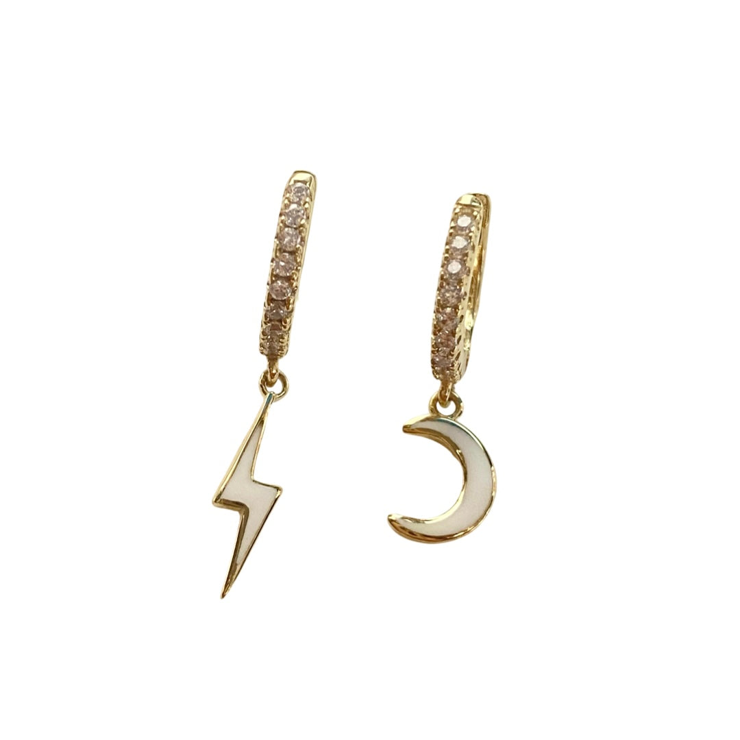 Adorn your lobe with our beautifully handcrafted pair of Celestial Lightning Bolt Moon Huggies. Features cubic zirconia paved hoops with a mismatch pair of enamel filled crescent moon and lightning bolt charms that will hug your lobes and sparkles with your every turn. For those with multiple piercings, looks great when mixed with other Noellery earrings to make your perfect everyday ear stack!