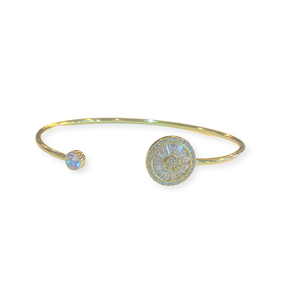 Our circle baguette bracelet has a luxurious look that leaves you speechless. The detail of the baguette stones being surrounded by cubic zirconia stones looks classy and dainty. Style your wrist with this bracelet on a night out with friends!