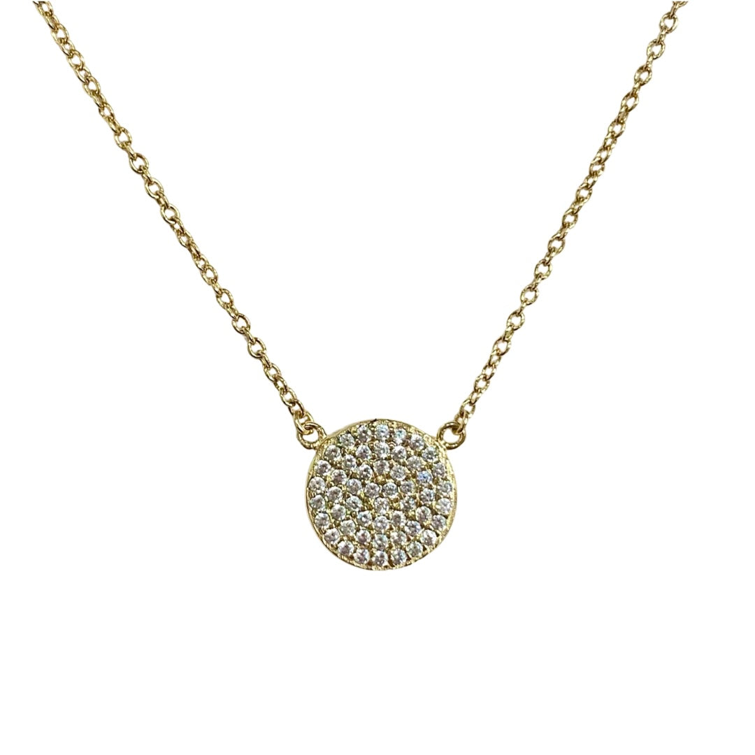 Up your sparkle factor with our sparkly Geovana Circle Disc Necklace. Beautifully crafted with love, and features a circle pendant that is micro paved with sparkly cubic zirconia stones. Modern and stunning- makes a wonderful gift for your loved one on any occasion.