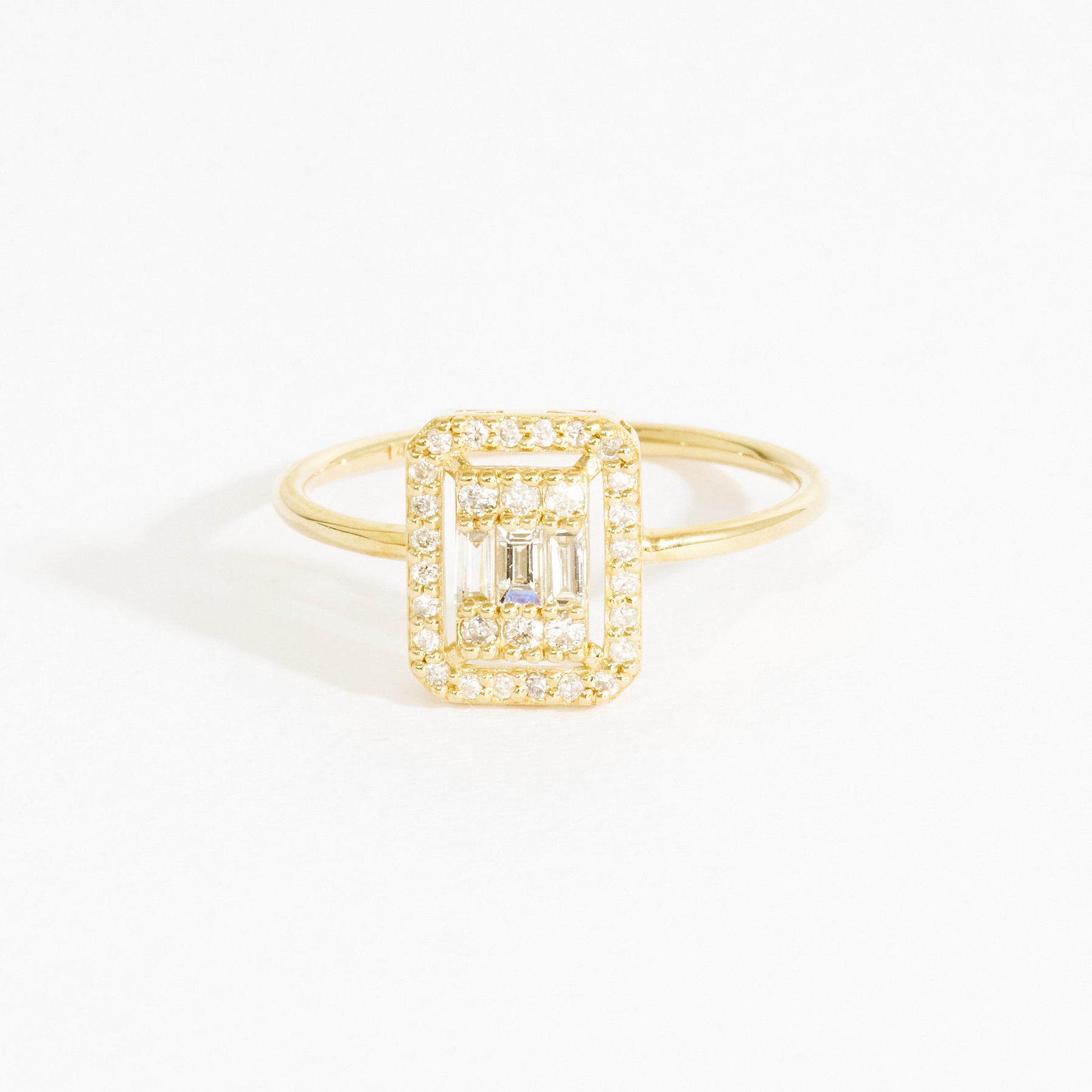 Style your fingers with a timeless statement piece that will accentuate your outfit. Handcrafted in 14k solid gold, the rectangular halo of small diamonds encompasses a raised organized cluster of baguette and round diamonds. A statement ring for the fashionable woman, wear this to any special occasion or as your everyday pick.