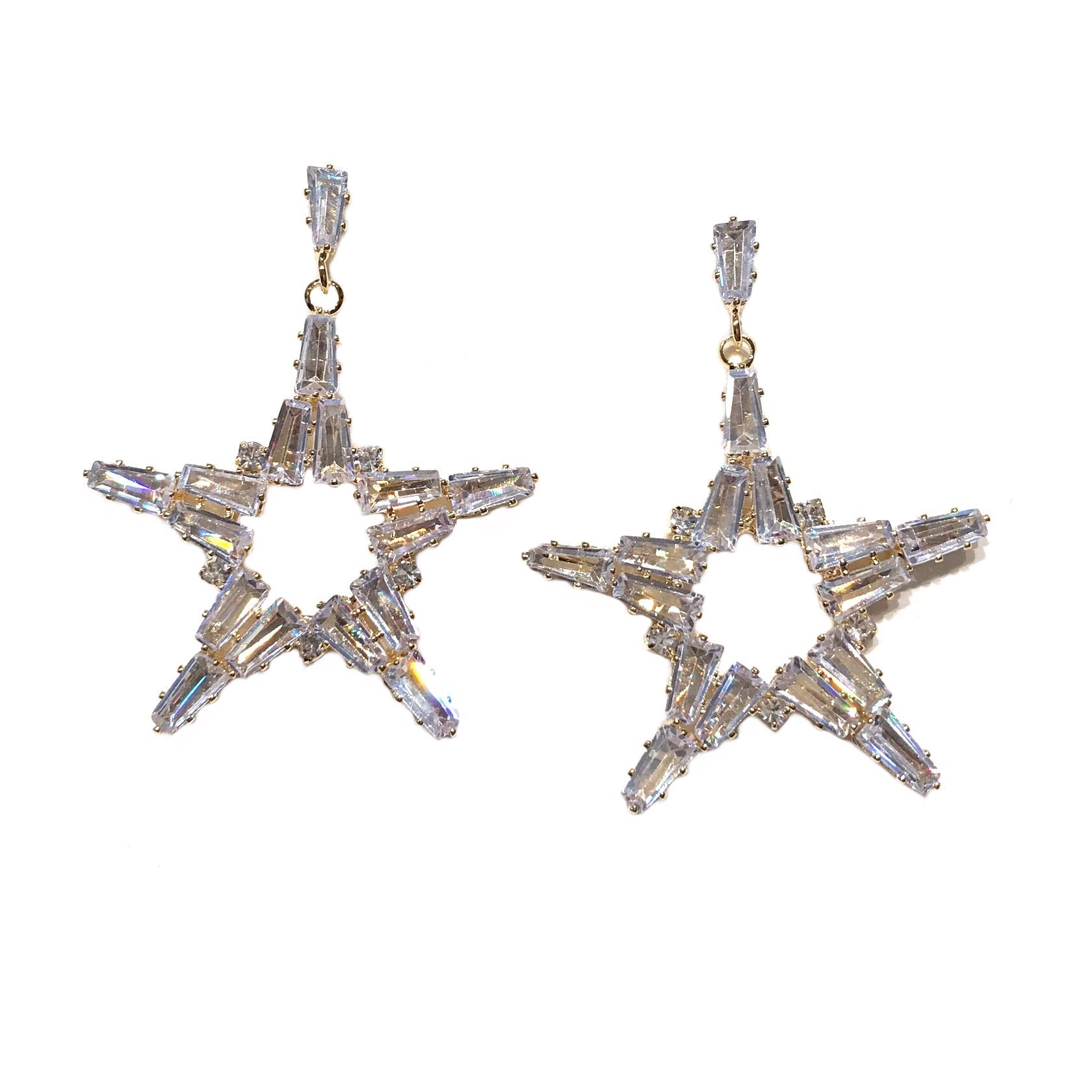 A statement piece that will leave you sparkling like the night sky, throw on a pair of our Crysta Star Earrings to elevate any outfit! Features baguette cut cubic zirconia stones that will catch the light with your every turn.