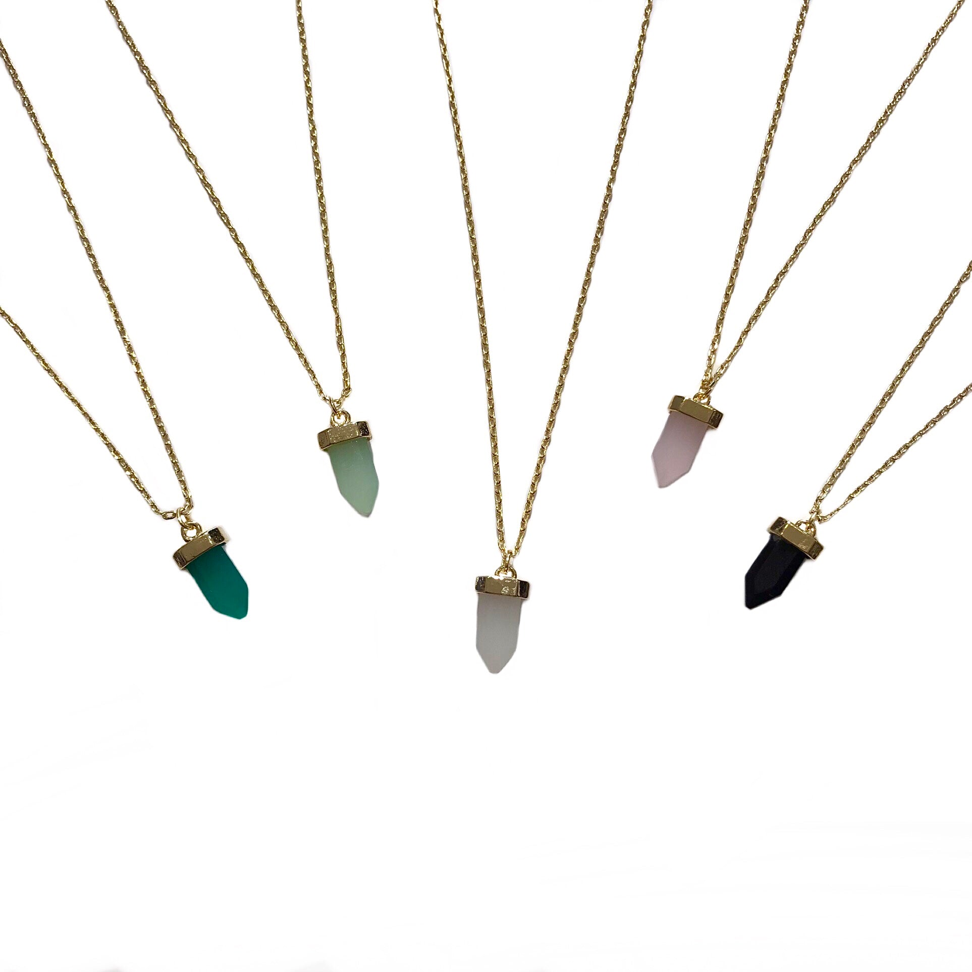 Dazzling crystals are on the trend! Add our Crystal Gemstone Necklaces to your necklace layer to complete your stylish everyday outfits! Features a spear, prism cut crystal gemstone that dangles from the plain chain. The centerpiece to any necklace layer, but also perfect enough to be worn solo.