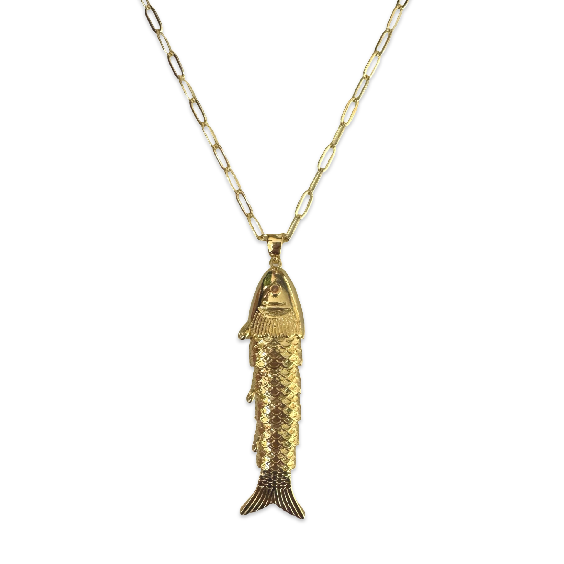 Dive into a sea of sophistication with our long gold fish pendant necklace. Handmade with meticulous detail on the scales, our fish necklace is a charming work of art whose pendant moves for good luck. The fish symbolizes happiness, prosperity, and abundance throughout different cultures around the world. Makes a thoughtful gift for a loved one for everyday wear.