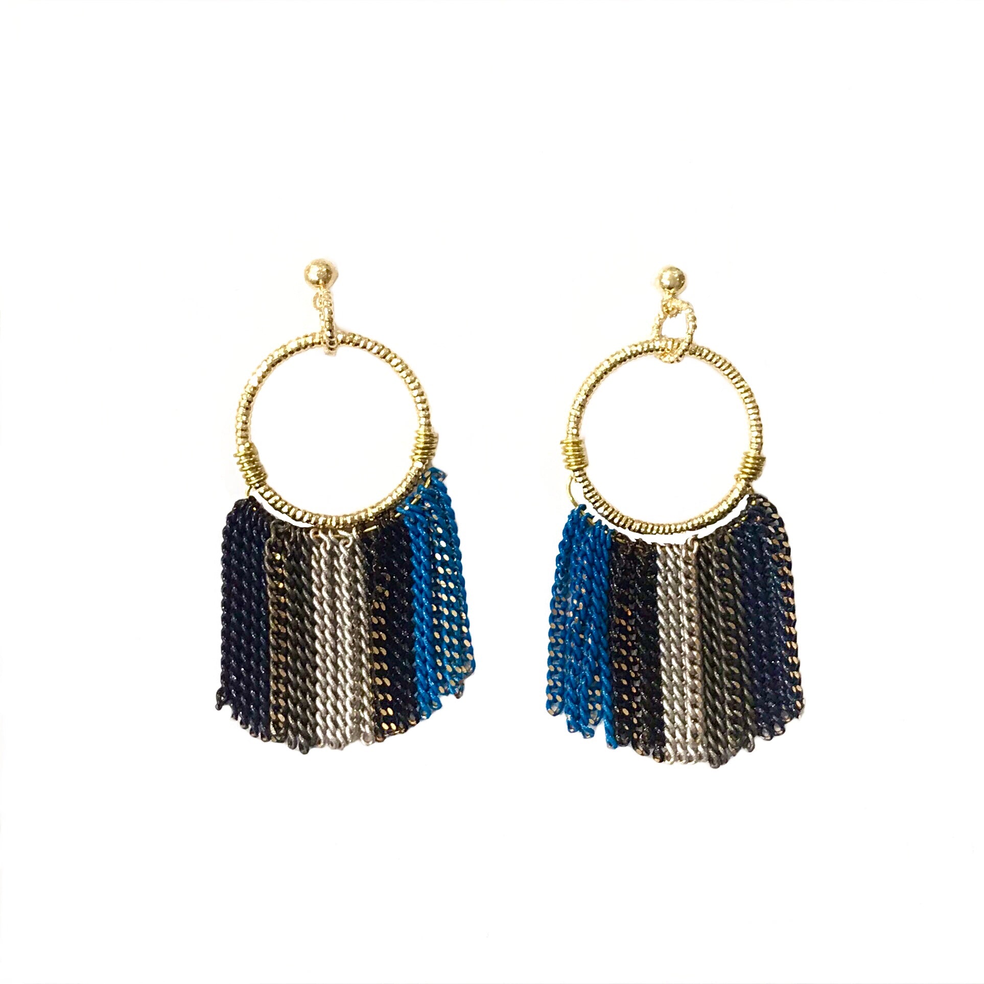 A casual but bold statement earring to elevate your outfit, this Circle Chain Drop Earring will gracefully drop from your ears and sway with your every step. With a simple ball stud, the diamond cut circle outline that drops from it holds the multicolored chains that will frame our face elegantly while adding a flare of color to your outfit. Makes a wonderful gift to the fashion forward woman looking for a minimalistic statement piece to add to their jewelry box.