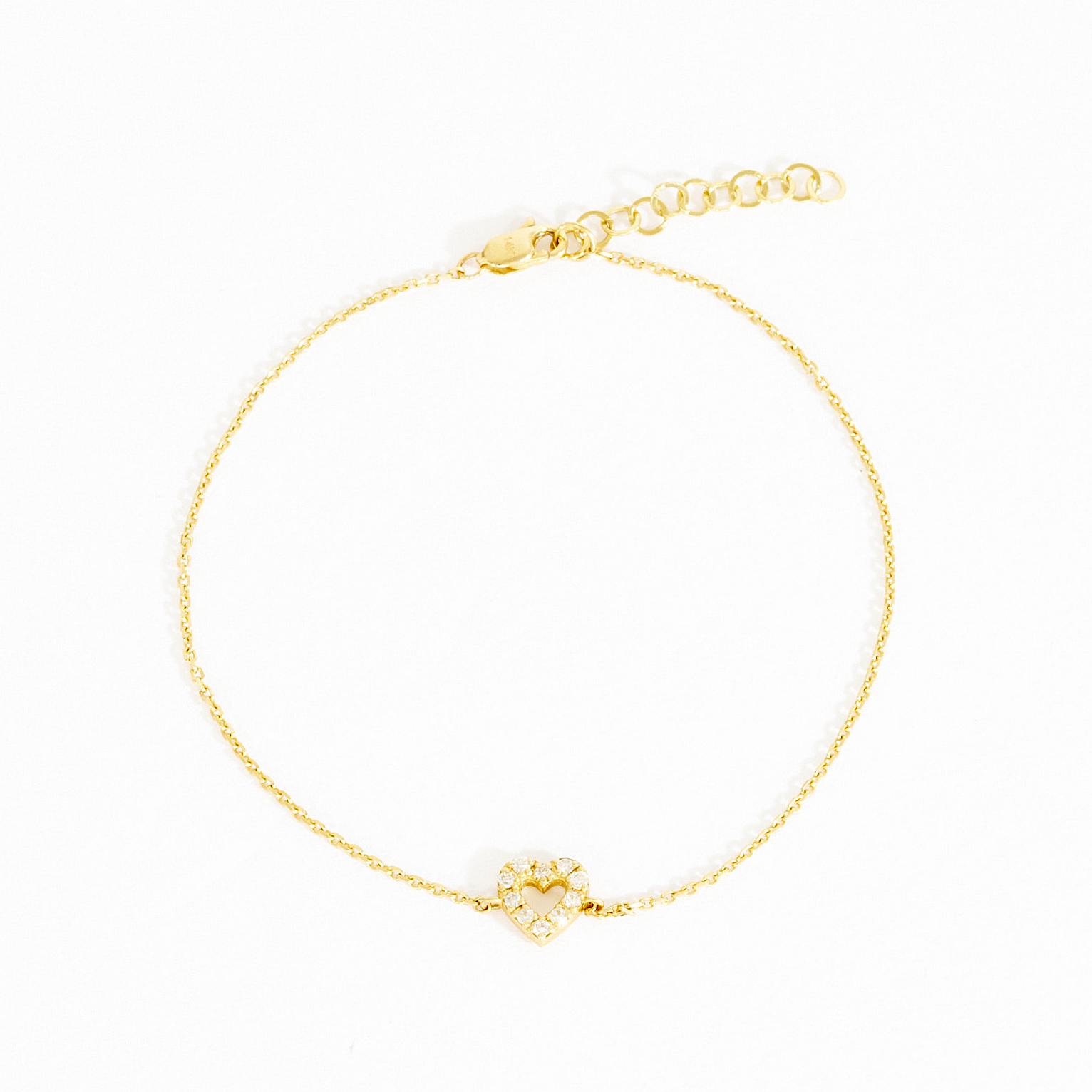 A dainty heart that will never fade away. Handcrafted in 14k solid gold, the heart outline is set with dazzling diamonds, making it a sparkling accessory to dress up your wrist. A dainty, yet glamorous everyday bracelet that will look great stacked with other delicate and love-filled pieces for her.