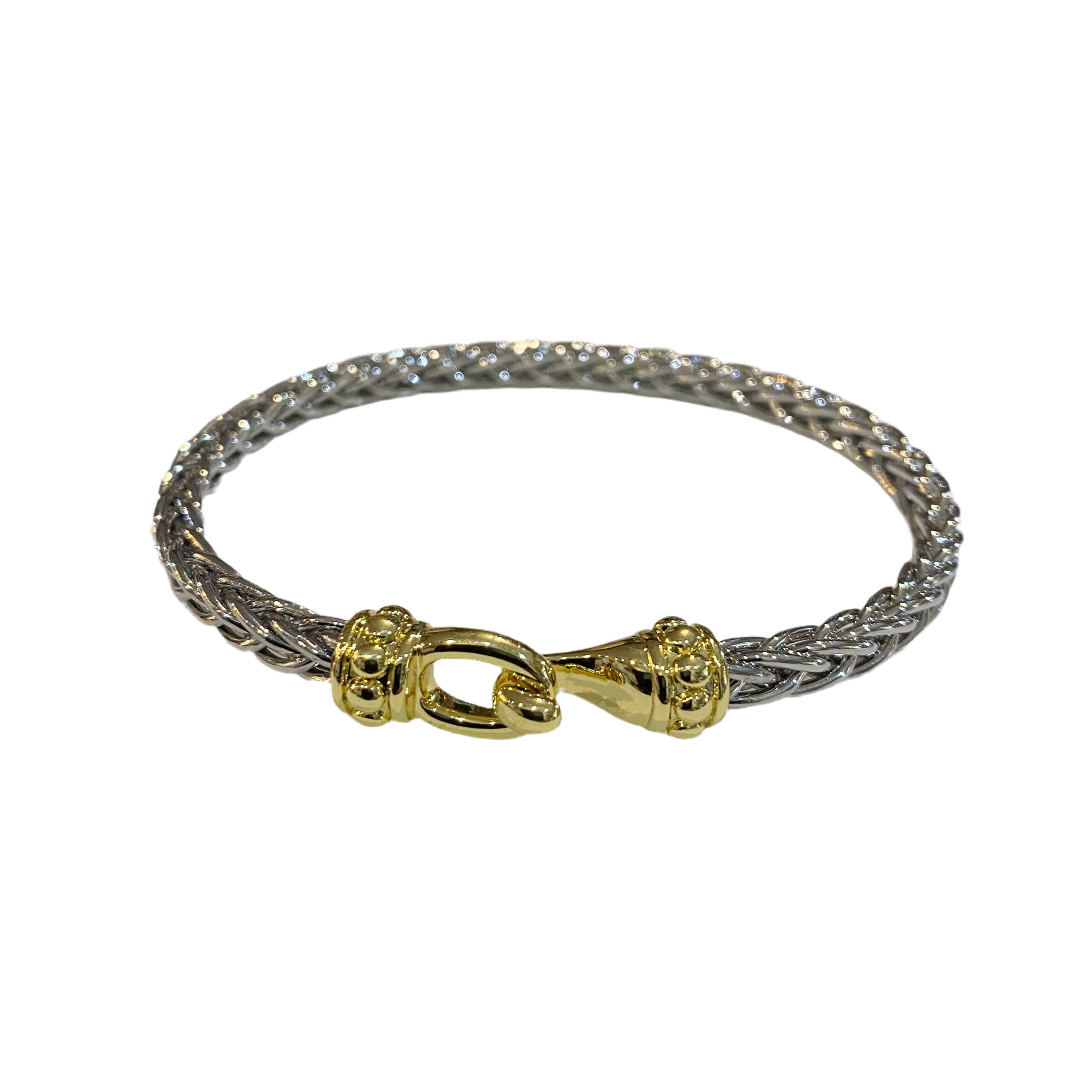 Our two-tone Dyana Hook Bracelet will make a great addition to your jewelry collection. May easily be worn with gold or silver jewelry. Beautifully made and comfortable for everyday wear.