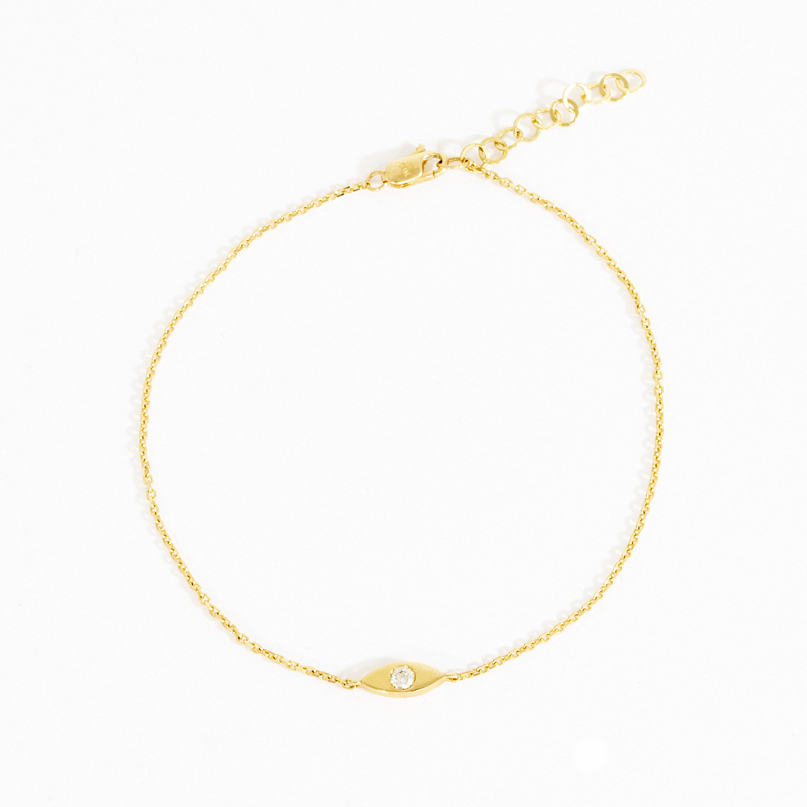 For the spiritual and trendy who are looking for a simple everyday accessory to wrap around their wrist. Handcrafted in 14k solid gold, the polished evil eye charm is centered with a single diamond for a delicate design. The perfect everyday bracelet that can be worn alone or layered with other dainty pieces.