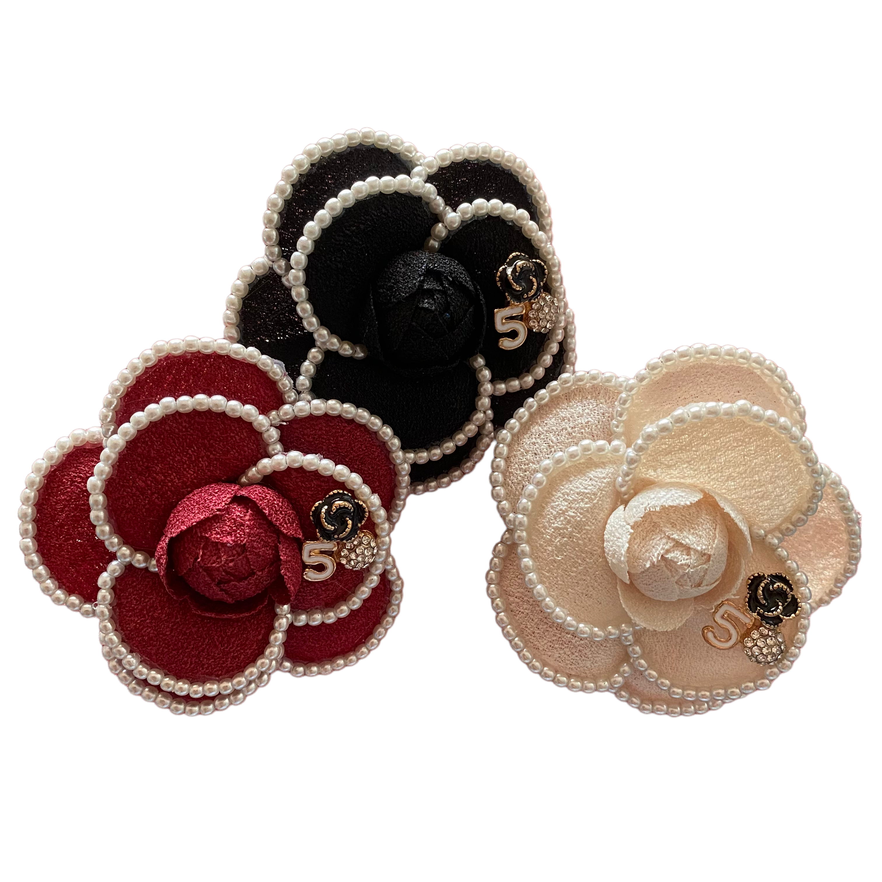 Accentuate any outfit by donning one of our statement brooches to pull your whole outfit together! These intricate felt flower brooches are lined with delicate pearls and features small flower charms made of enamel or crystals, along with a small enamel five. Secure it to your outfit with the bar pin or the duck-bill clip if you don't want to leave a mark on that dressy outfit. The perfectly sized brooch to be the statement piece of any outfit for all the fashionistas out there.