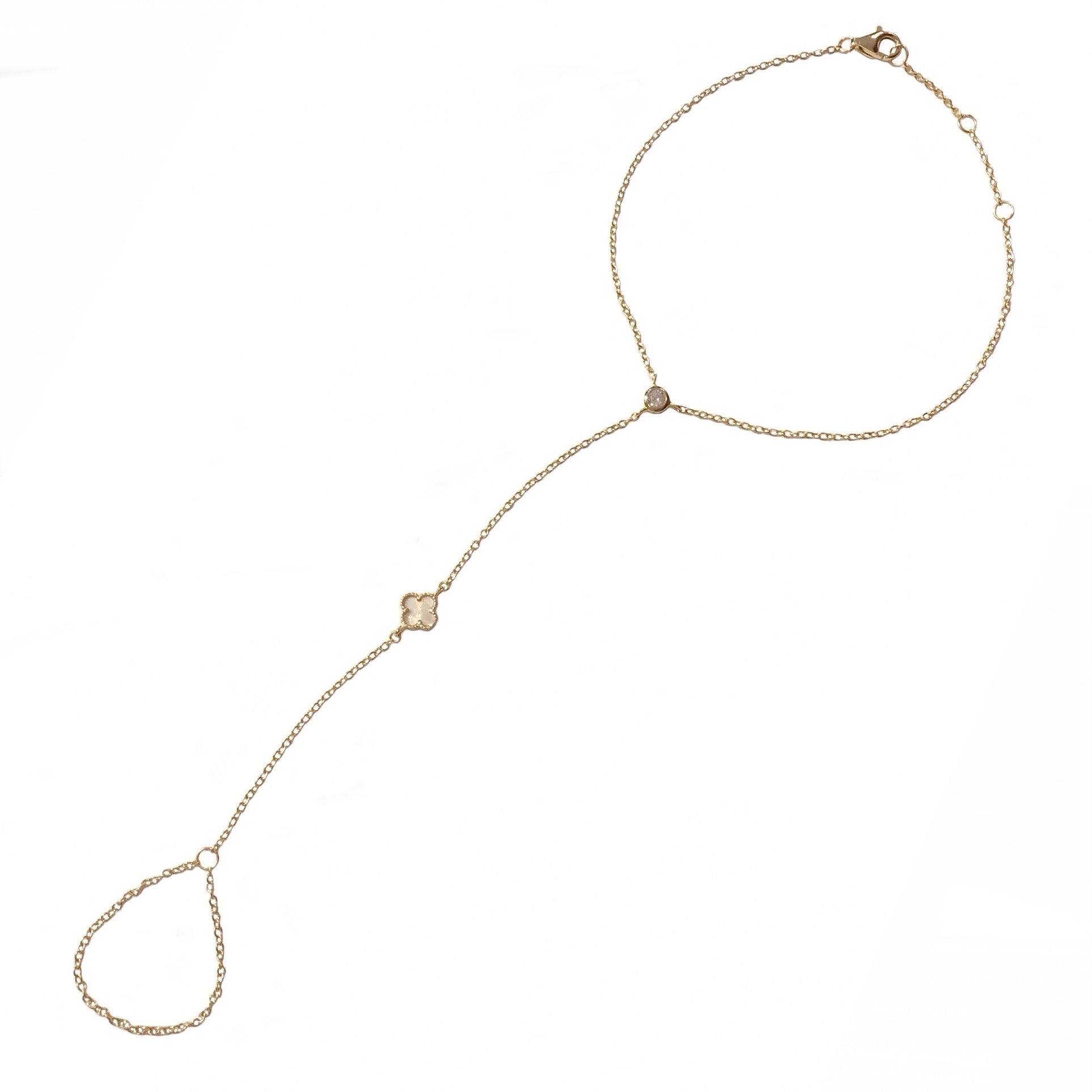 A hand chain for everyday wear. Our Flora Bezel Hand Chain is handcrafted with a plated sterling silver chain that loops from your finger to your wrist. The mother of pearl flora gemstone bezel adds a classy look, with the cubic zirconia bezel in the center will sparkle with every turn of your hand. Stack it with other Noellery bracelets and rings to compliment your outfits.