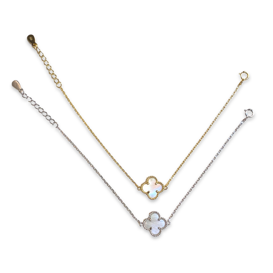 Stack up your wrist with some elegance and adorn our Flora MOP Bracelet! Attached to the dainty sterling silver chain is a mother of pearl four petal charm that will grab everyone's attention! Stack it with other Noellery bracelets and cuffs to bring out the beauty of the pearl!