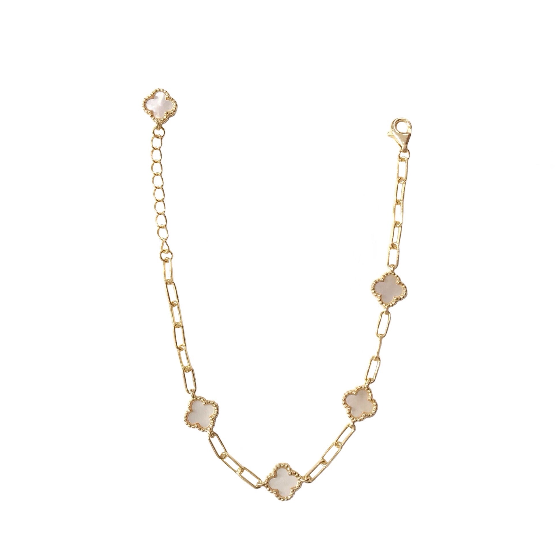 A trendy addition to your wrist stack, our mother of pearl Flora Station Paperclip Bracelet will add some character and glimmer to your wrist all day long! With a station of four petal clover charms on the paper clip chain, this chic bracelet will catch everyone’s attention from all angles. The perfect wrist accessory for the modern and stylish woman, it can be stacked with other Noellery bracelets and cuffs, or worn on its own for a simple touch of sophistication to any outfit.