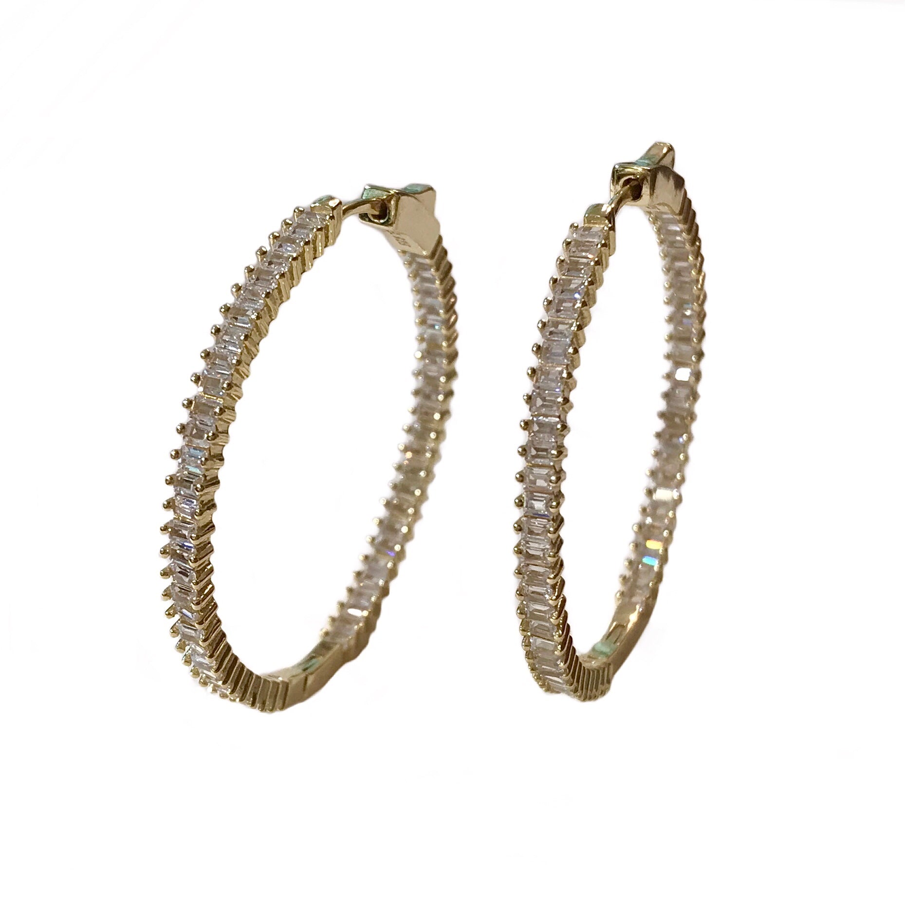 Add some bling to your ears and adorn our Thin Baguette Hoops! These hoops feature a channel of baguette cut cubic zirconia stones on the front and inside, so they can sparkle no matter which way you turn! With a french clasp backing, it ensures the wearer a secure fit with no fear of falling off. Lovely when worn with your hair own up, these hoops can be worn dressed up or down by itself, or even stacked with other Noellery earrings for those with multiple piercings! Makes a great gift to your loved one as well for any occasion!