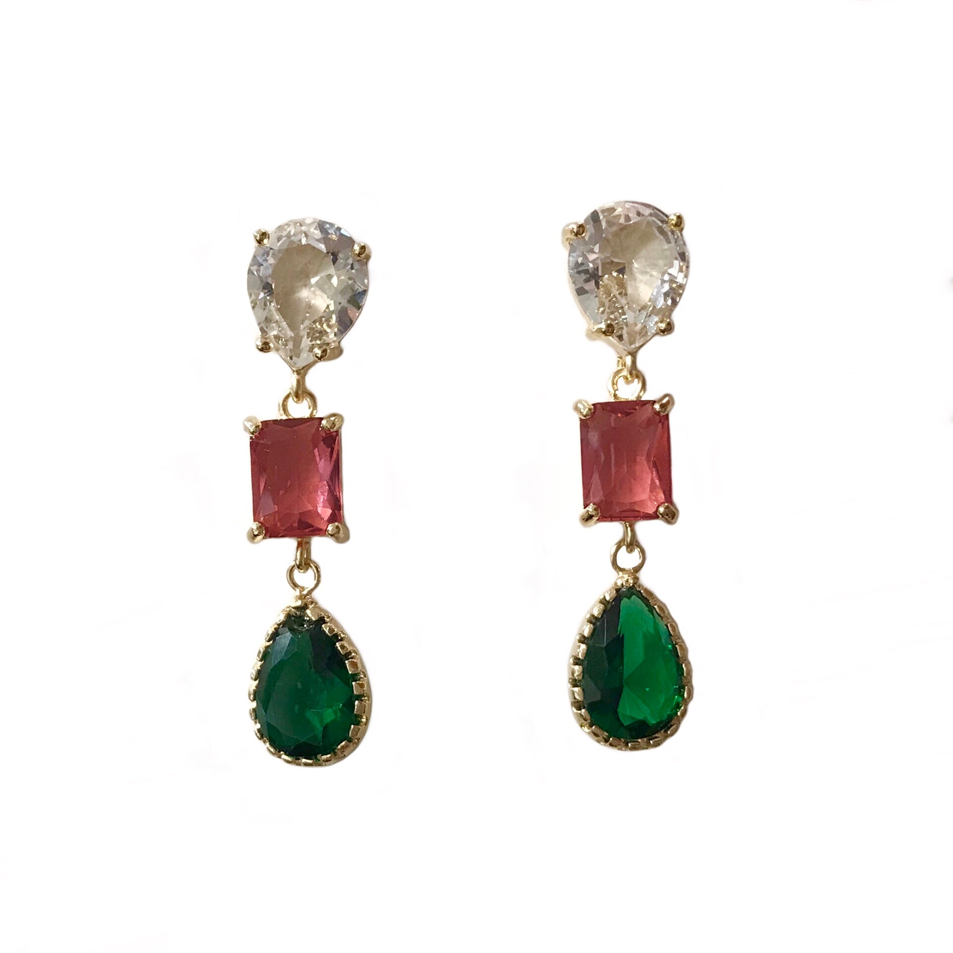 An eye-catching statement earring that stands out from the crowd, throw on a pair of our Geometric Teardrop Drop Earrings! With a clear teardrop stone stud at the top, the rectangle-shaped colorful stone drops from it, followed by another colored stone in the shape of a teardrop, creating a striking combination. Give this to loved ones for any occasion—it would make a lovely addition to any fashionable woman's jewelry box!
