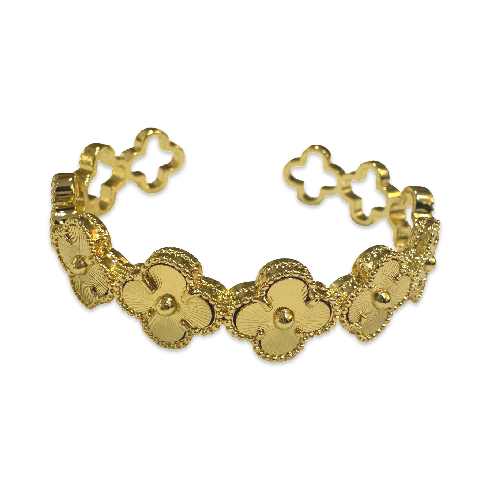 A chic and trendy design that will level up your outfit, slip on our bold Flora Cuff today! This statement piece features ridged clover designs in the front that will shine with every turn of your hand, with clover outlines at the ends. Can be worn alone but stacked with other bold Noellery cuffs.