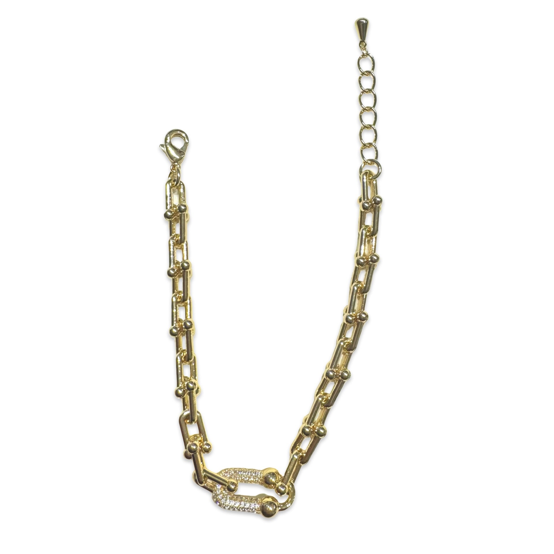 Add our Gold Filled Chain Bracelet to your jewelry box today! Features a high shine lightweight buckle chain that is centered with a cubic zirconia paved link that will add shine to your wrist. Lightweight and dainty for all day wear. Makes a wonderful addition to your wrist stack.