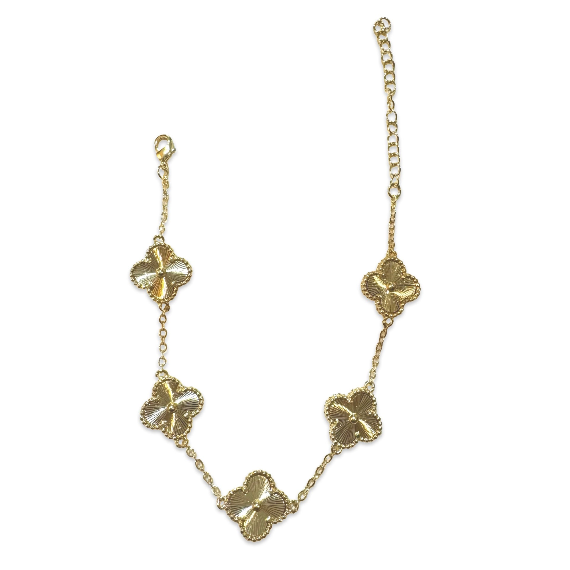 A chic and trendy design that will level up your outfit, slip on our bold Flora bracelet today! This statement piece features ridged clover designs in the front that will shine with every turn of your hand, with clover outlines at the ends. Can be worn alone but stacked with other bold Noellery cuffs.