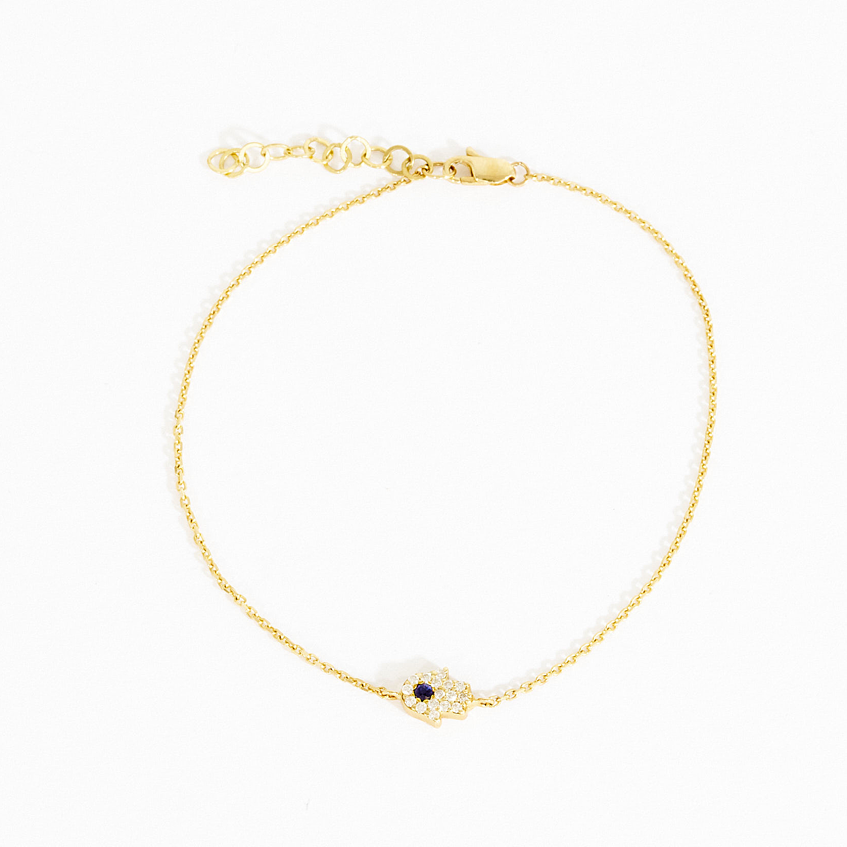 A modern and spiritual piece to add a layer of protection around you. Handcrafted in 14k solid gold, the tiny hamsa charm is paved with diamonds and centered with a sapphire stone. The perfect everyday bracelet that can be layered with other dainty pieces or worn alone.