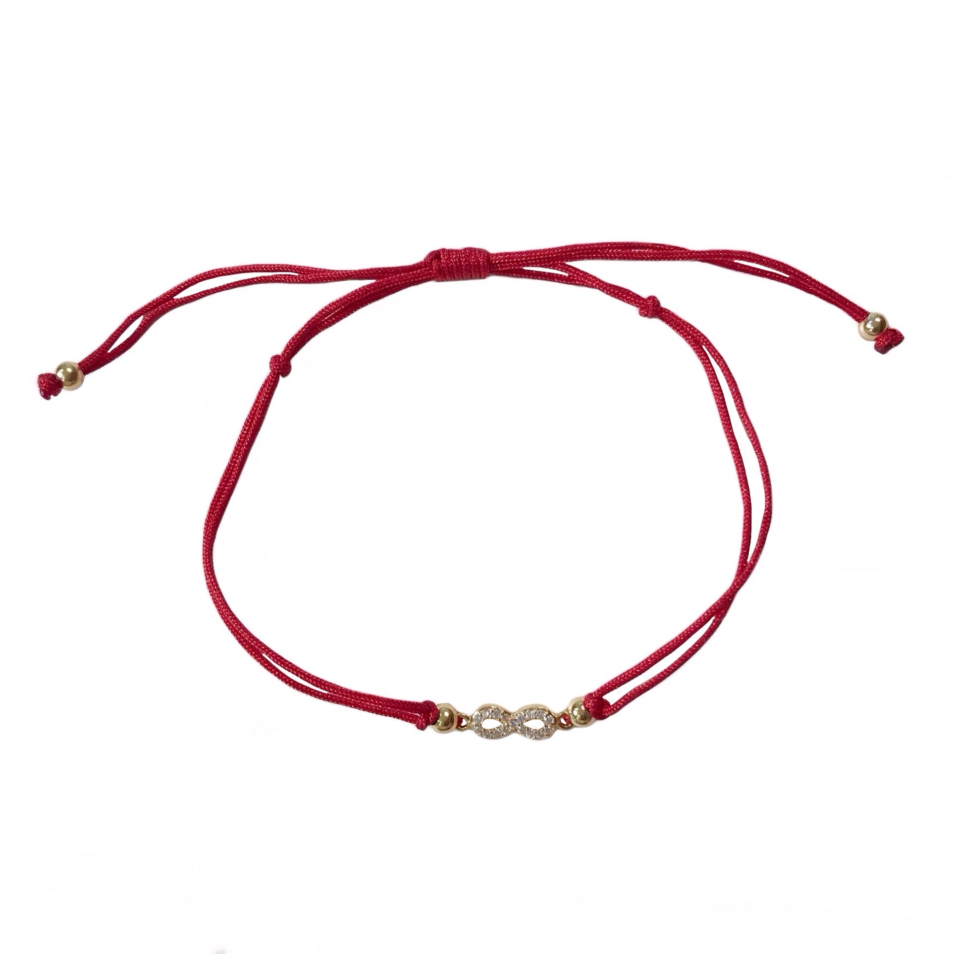 Accessorize your wrist with our Dainty Infinity Bracelet! Features a dainty infinity pendant that is paved with sparkly clear cubic zirconia stones. Infinities represent forever, and the red thread signifies protection and good luck. Make this bracelet sparkle even more by stacking it with a Noellery bangle or cuff. Remind her that your relationship will hold strong to infinity and beyond, and gift her this bracelet today.
