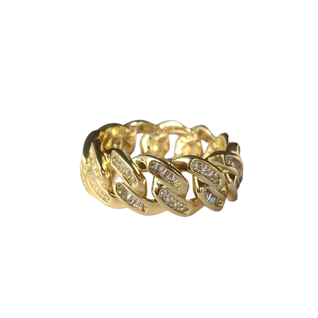 Slip on our Noellery Joellery Baguette Chain Link Ring for a bold and shimmering look! This thick Cuban chain ring features baguette cut cubic zirconia stones all around, giving it some shining sparkle with every twist of your hand! The perfect gift for him or her, this cuban chain link ring is the perfect accessory to add to your everyday outfit!