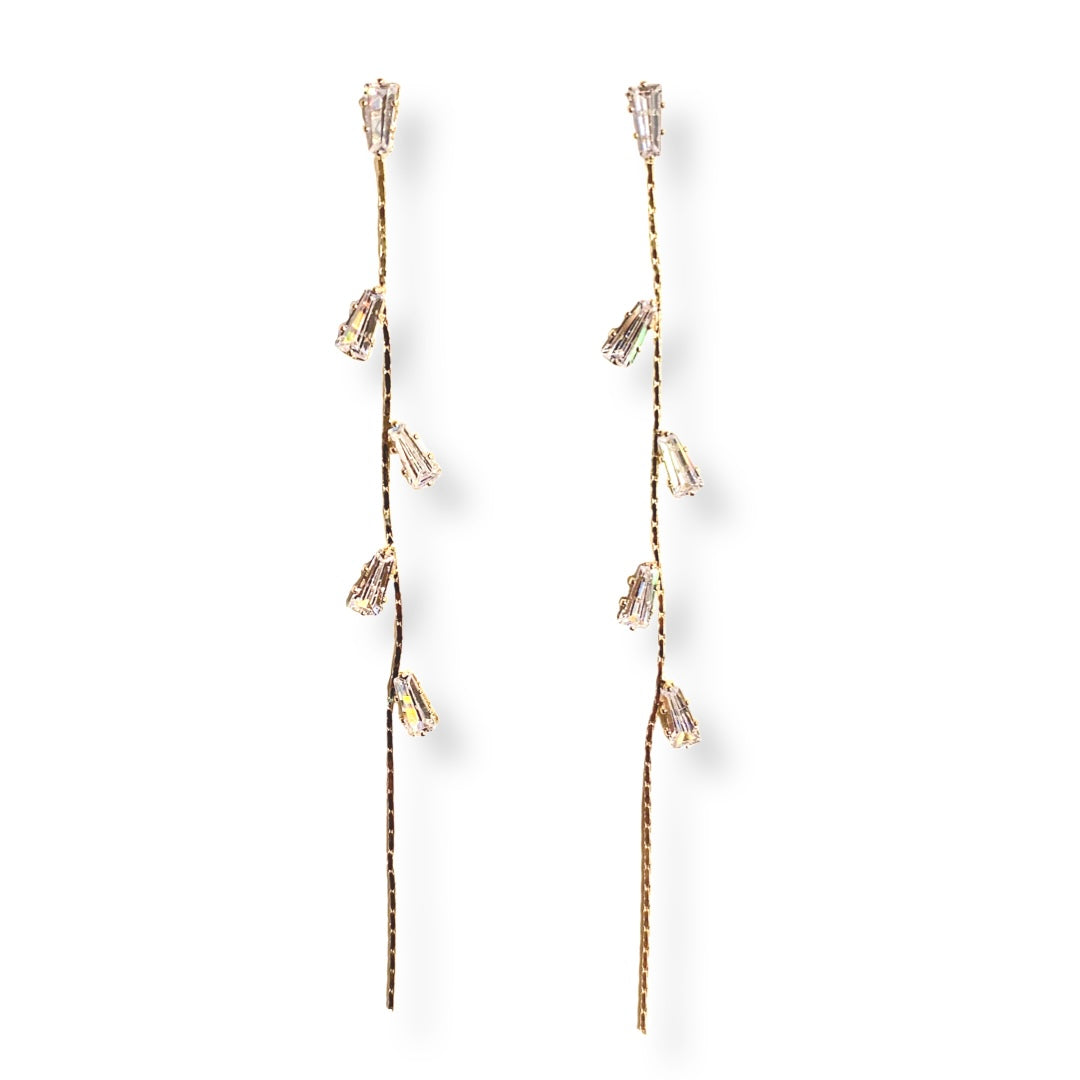 Sparkle and shine with our dainty and minimal Krista Baguette Earrings. Features a baguette stone stud that drops into a single chain that holds four cubic zirconia baguettes. Falling gently from your lobe, these earrings add the perfect amount of shimmer for the fashion forward woman, and lightweight enough to wear everyday.