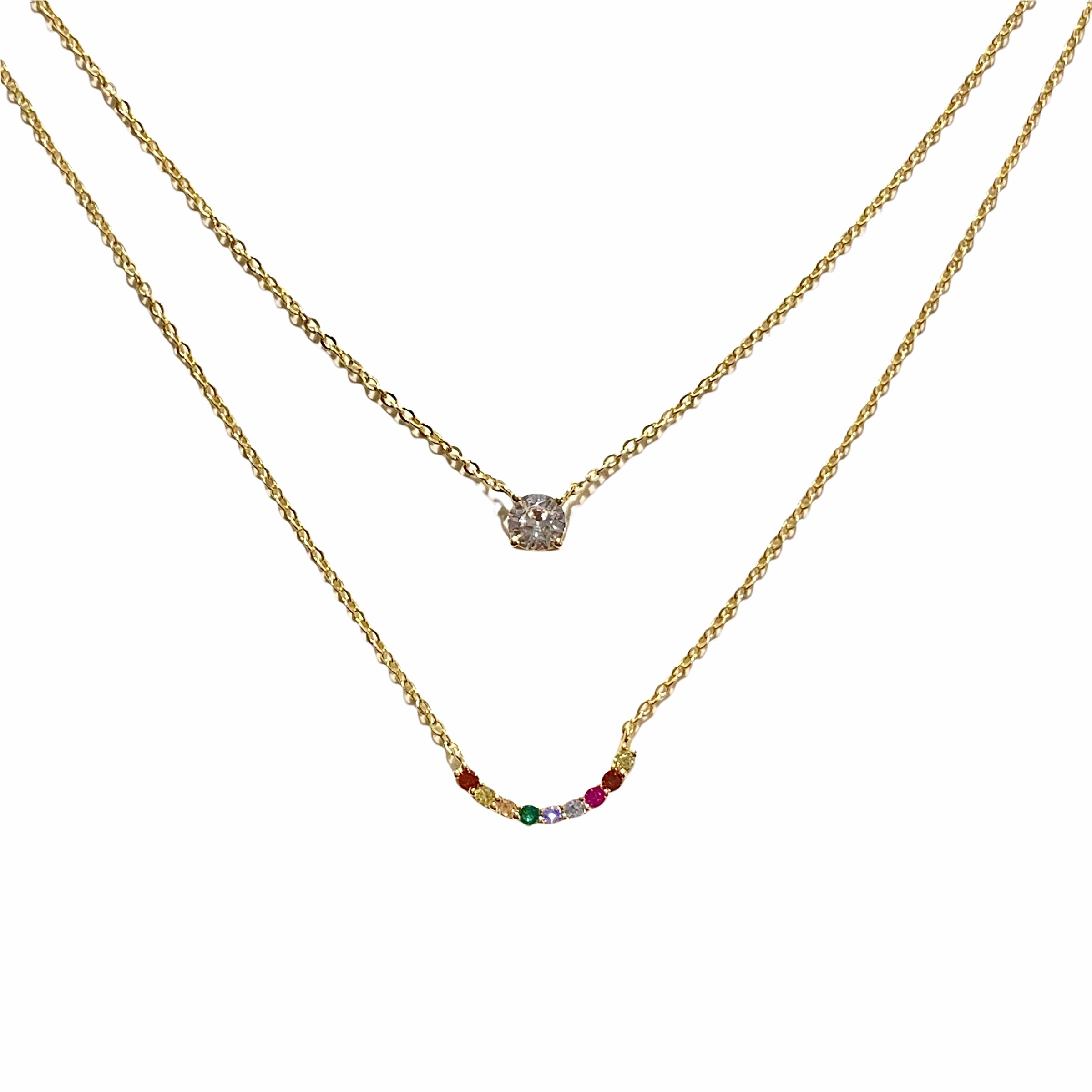 Bright like the rainbow, our Layered Rainbow Bar Necklace is just the accessory to complete your outfit! This pre-layered necklace features a cubic zirconia bezel on top and multicolored cubic zirconia stones on the bottom. Makes a great everyday necklace to match with any outfit!